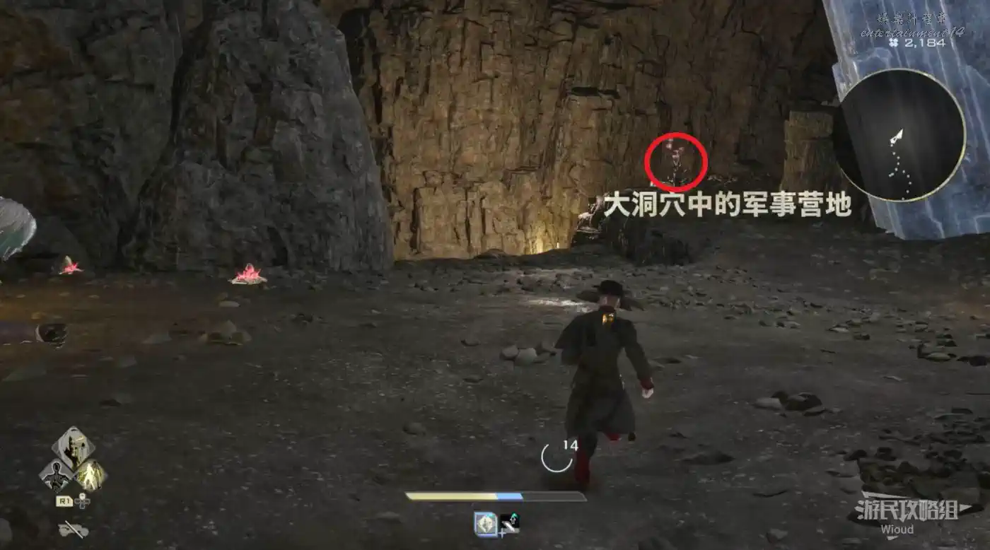 從“臺地下的小營地”出發往上方“採掘場北端的洞窟”移動。