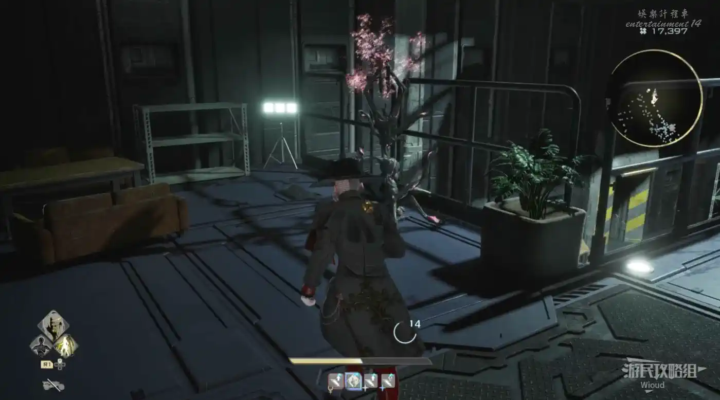 乘坐盡頭的電梯上去,打開對面的唯一的門,找到一個散發粉色粒子的小樹。
