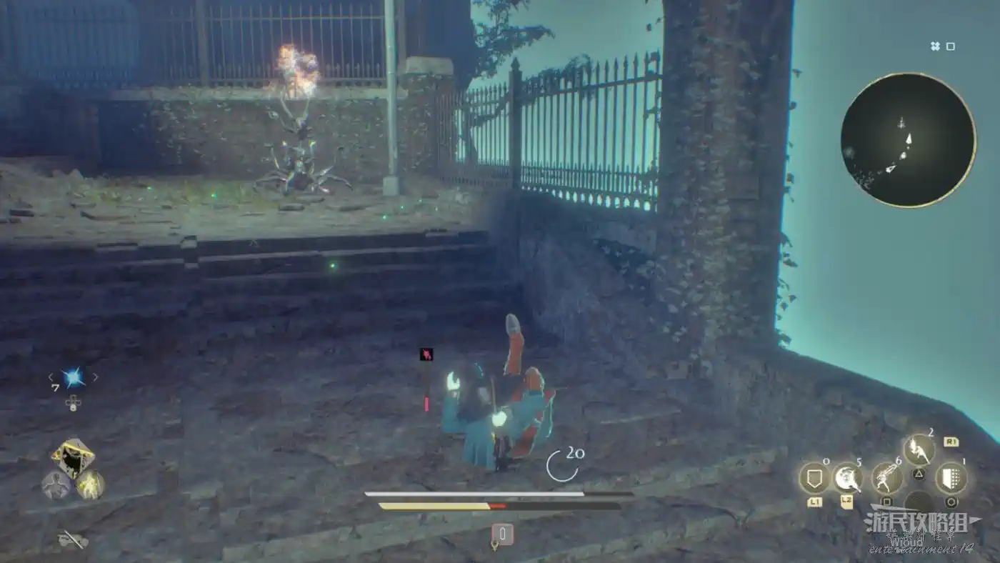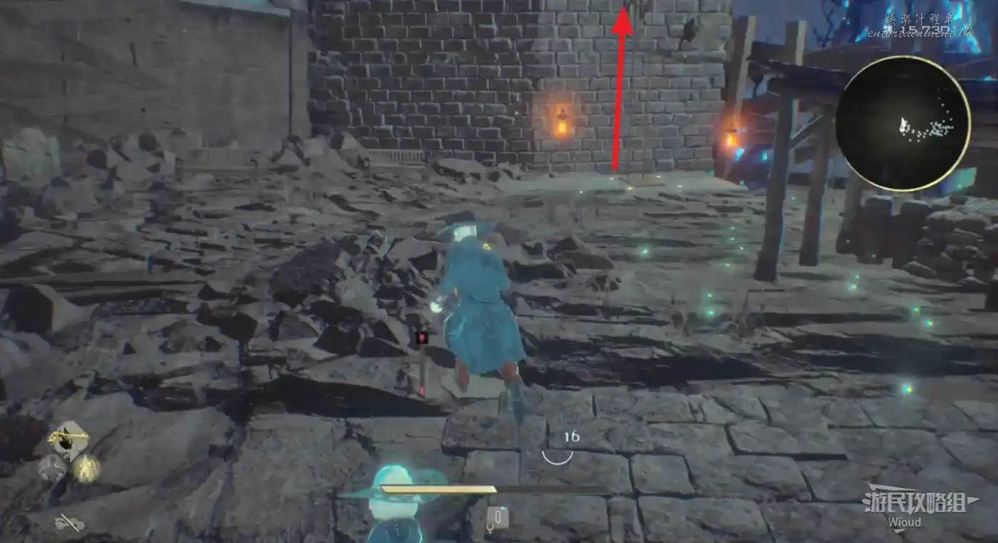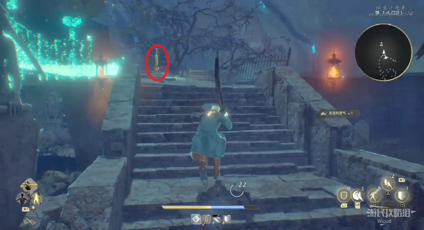 穿過石橋就沿著腳下的路走,看到一個大門時注意路邊的藍色發光道具,拾取可用於增加血瓶上限,另一種長相極其類似的道具則是增加血瓶恢復量。