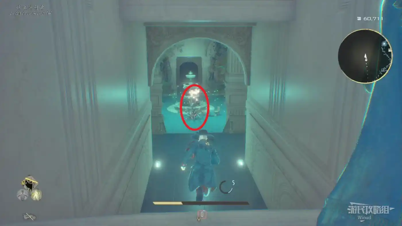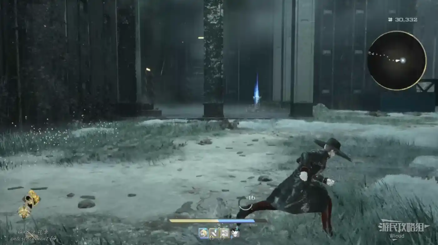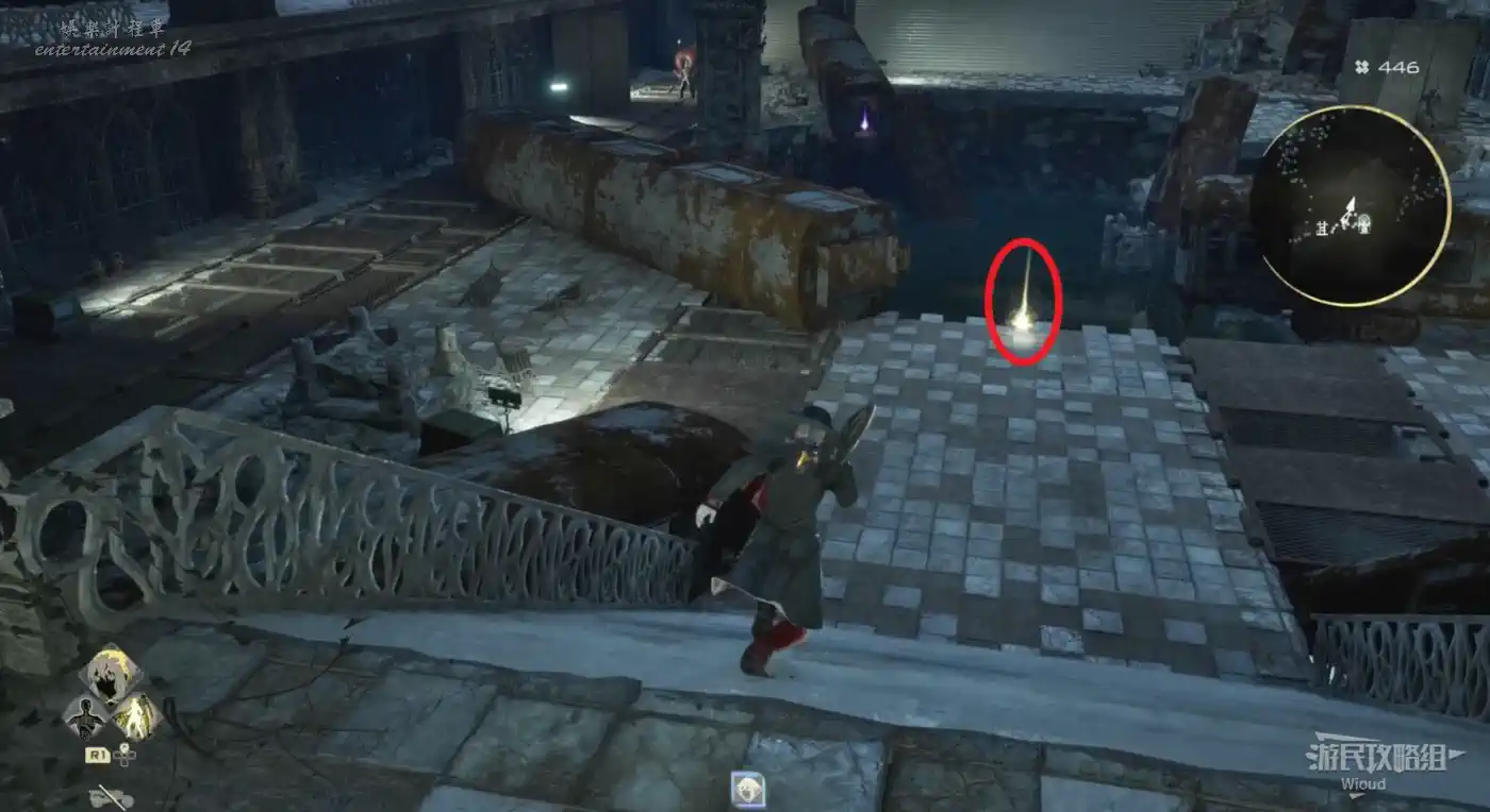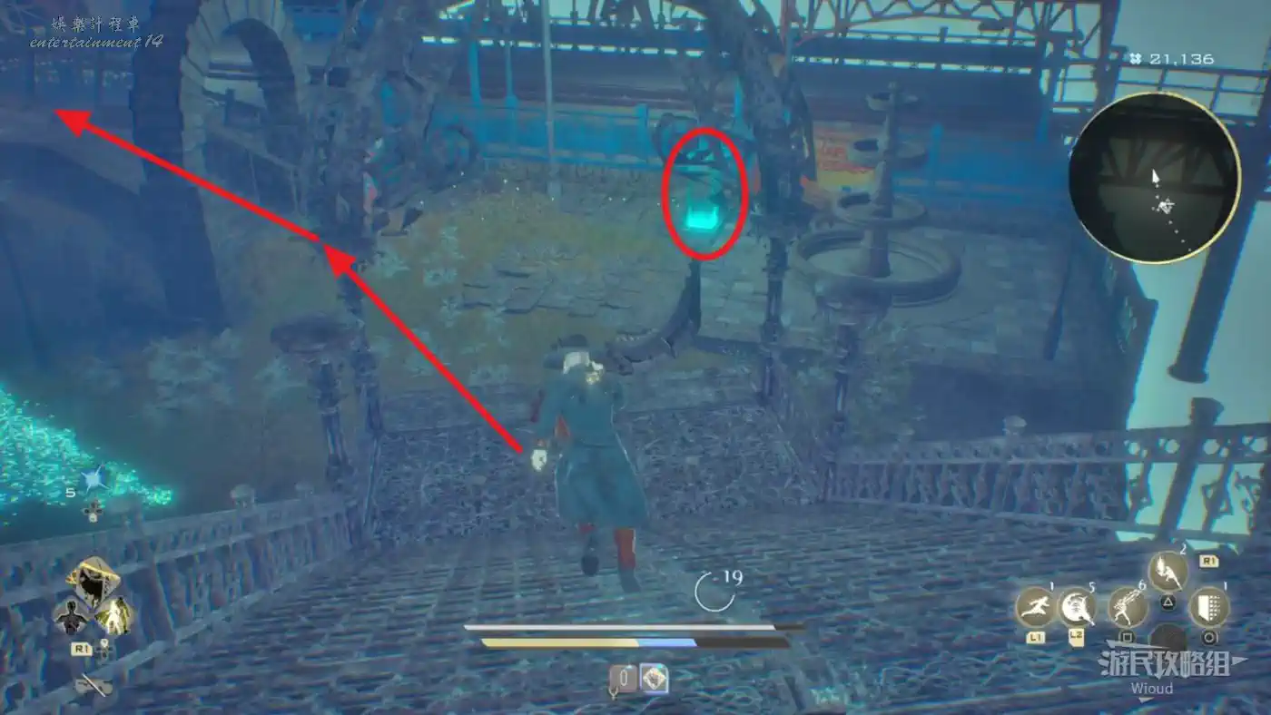 穿過石橋就沿著腳下的路走,看到一個大門時注意路邊的藍色發光道具,拾取可用於增加血瓶上限,另一種長相極其類似的道具則是增加血瓶恢復量。