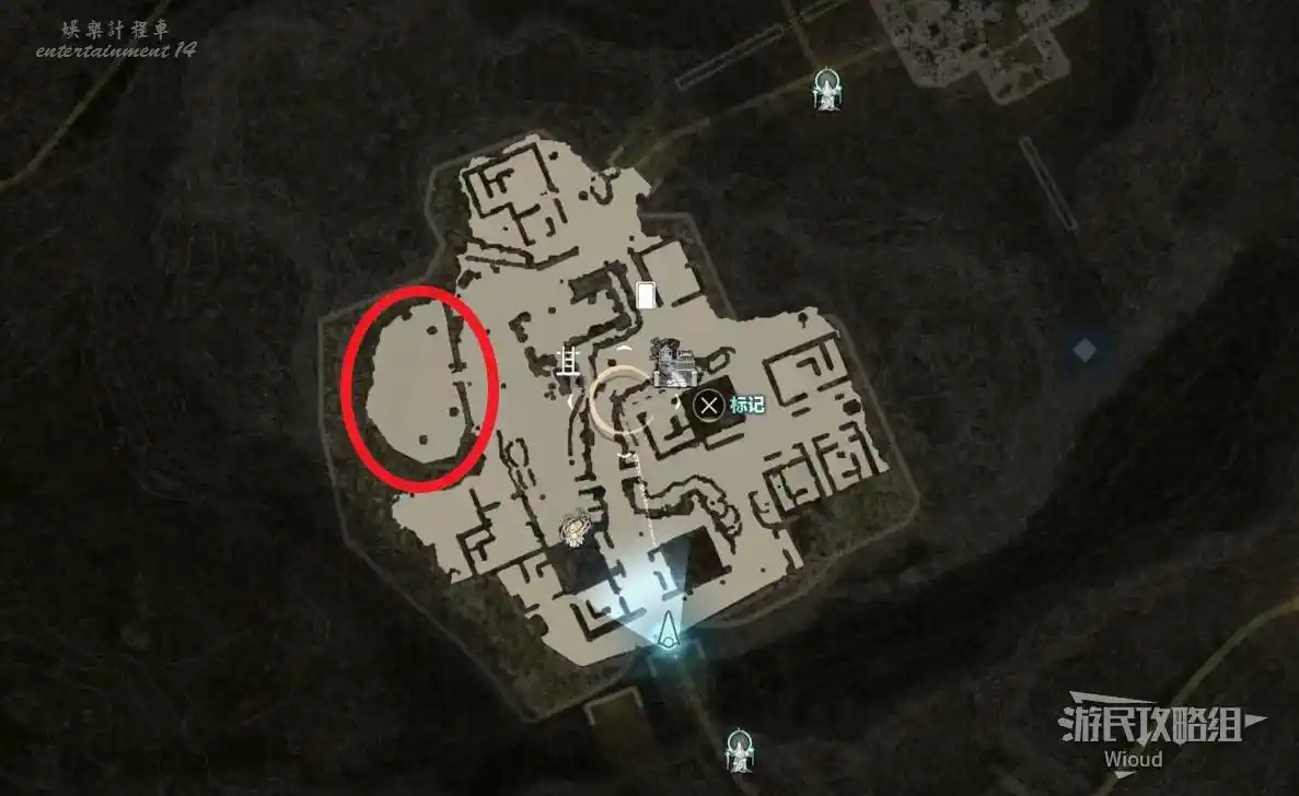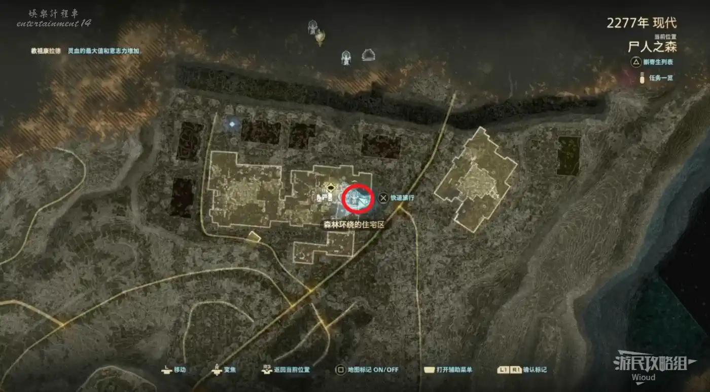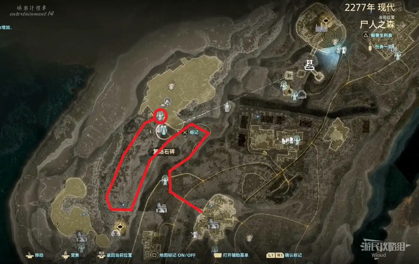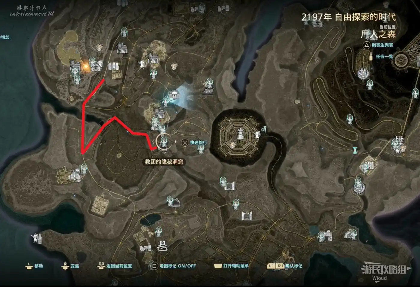傳送到“屍人之森”中部,沿著下圖紅色路線移動到“教團的隱秘洞窟”。