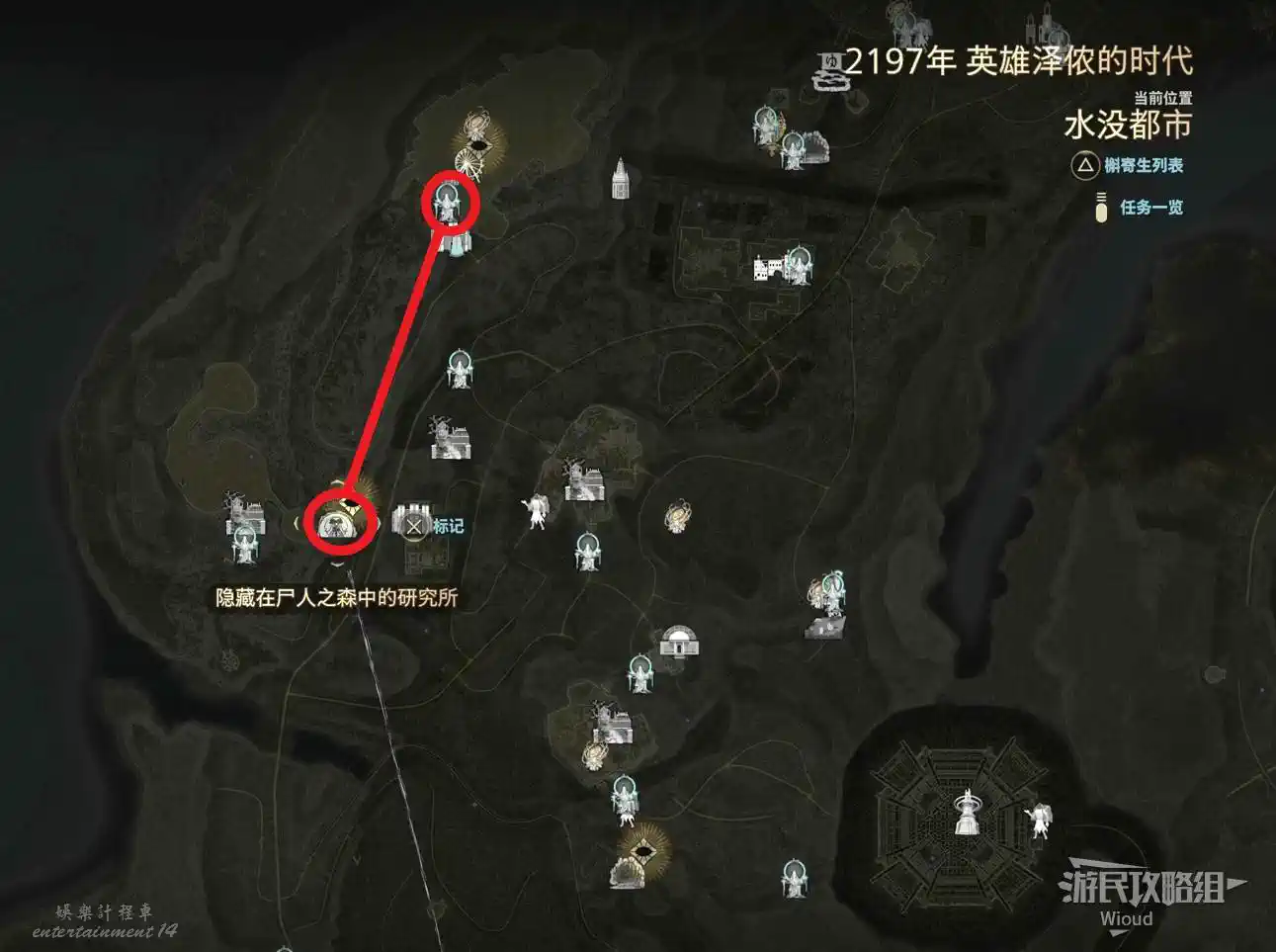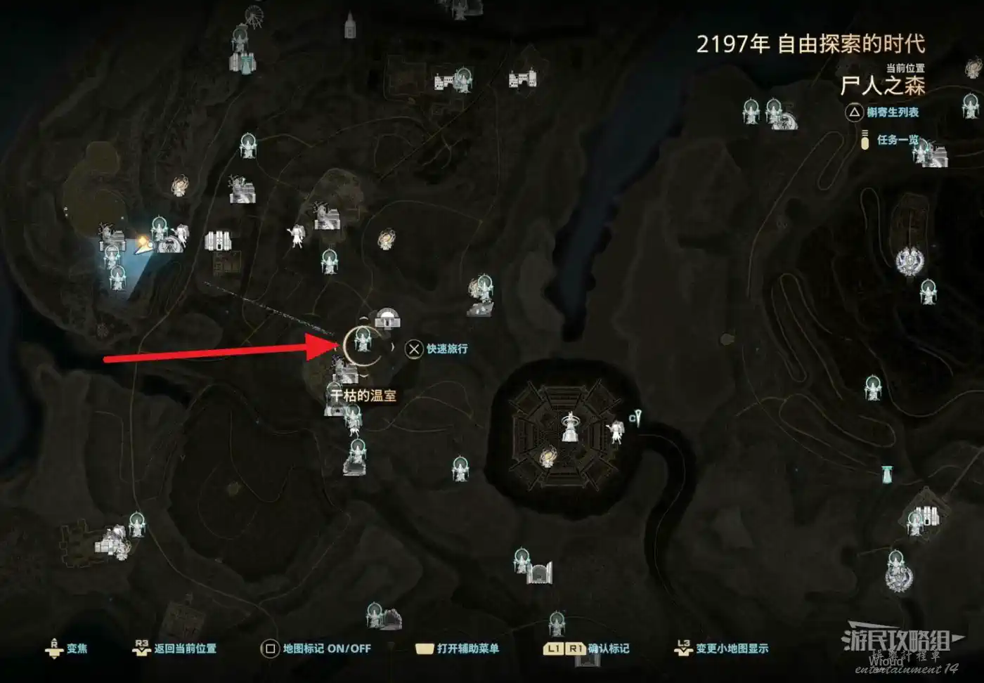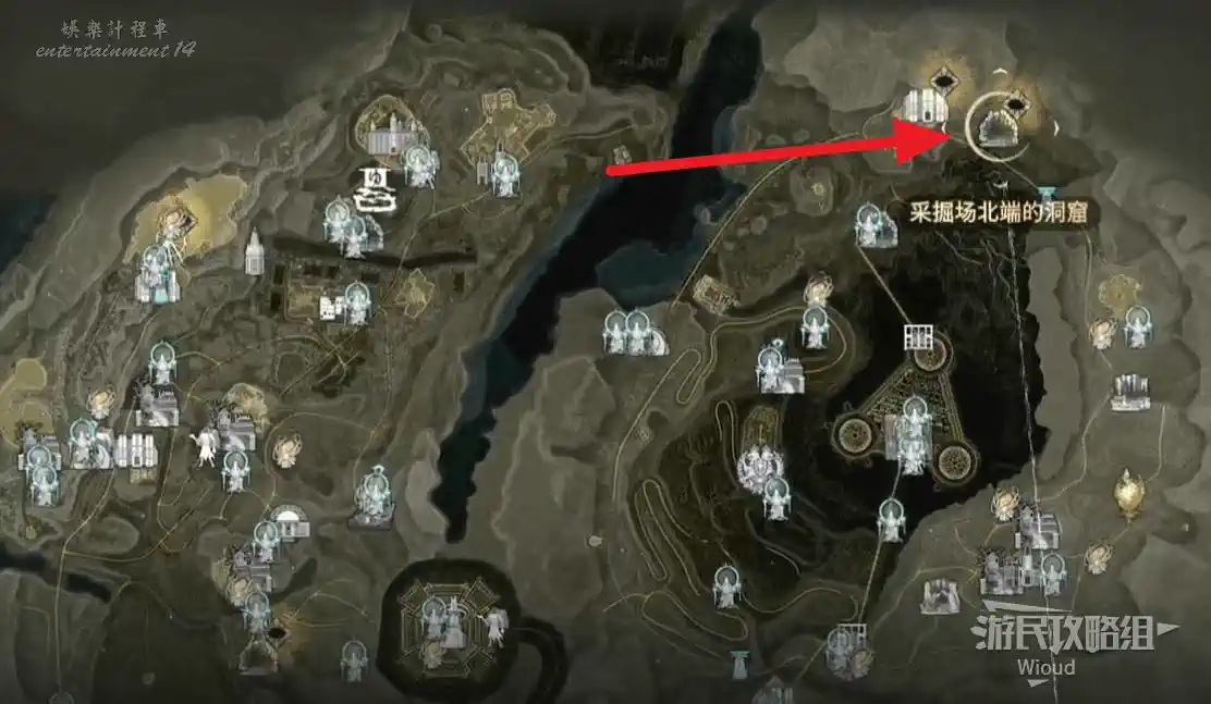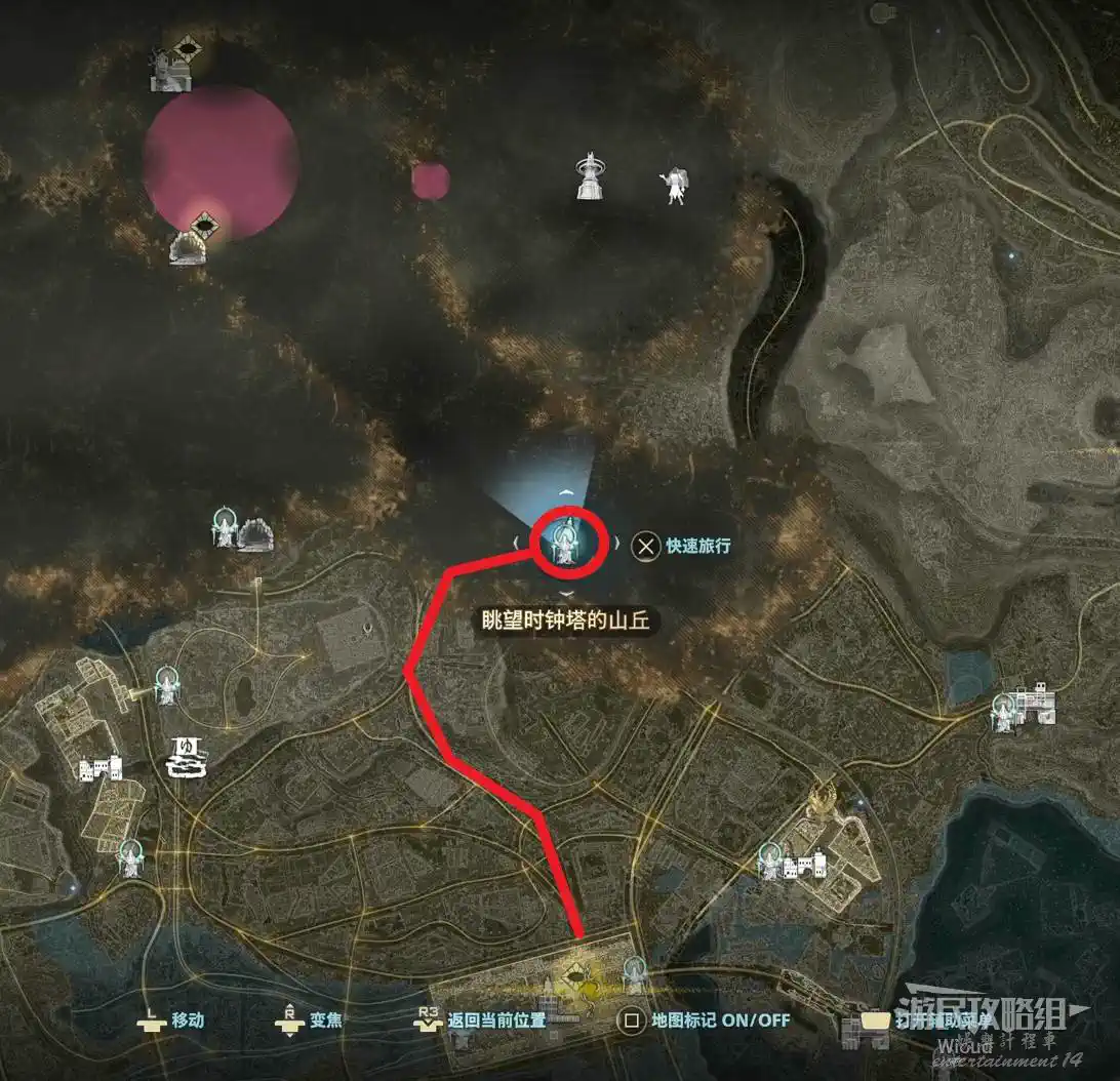傳送到“屍人之森”中部,沿著下圖紅色路線移動到“教團的隱秘洞窟”。