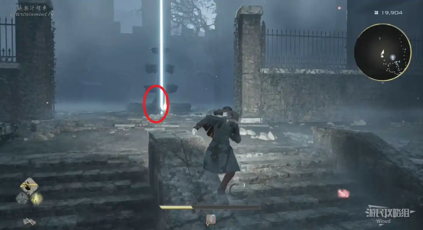 爬樓梯下去,先往右走,再貼著左牆連續左拐,在紅圈所示處開一個寶箱,獲得武器“古代獵人的浮空劍”。