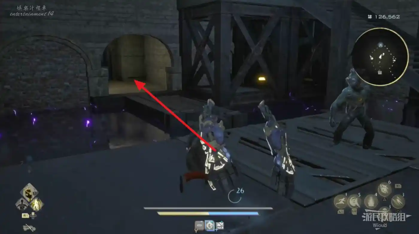 穿過一個黃色柵欄門,發現一個帶紫電的水池,水池的左側面有兩個凹口,一個有寶箱,打開獲得防禦術式“瞬影”靠裡的有個被木板擋住的入口。