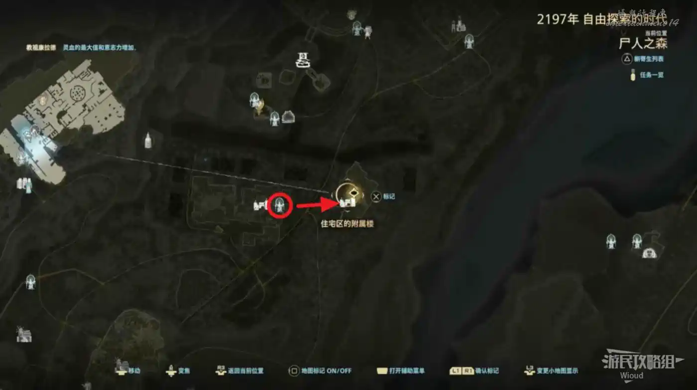 傳送到“森林環繞的住宅區”移動到右側的“住宅區的附屬樓”。