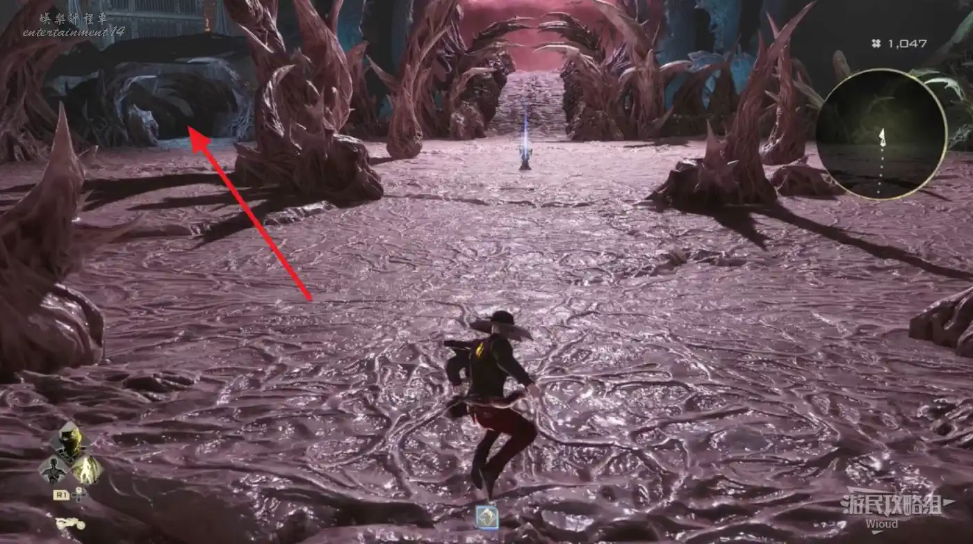 最後在小樹位置轉頭,進入身後高處的BOSS房,門口有個復活石,互動後無限在BOSS房門口復活。