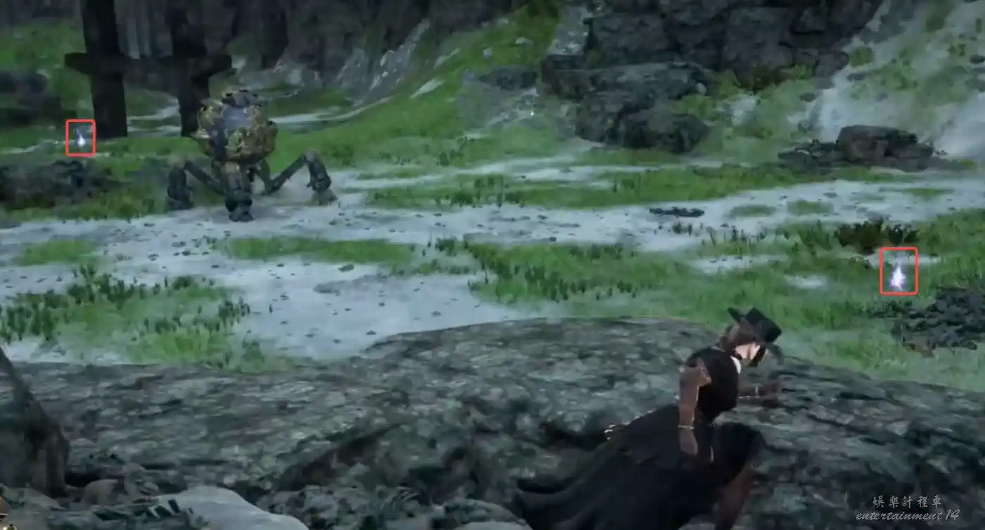 先從橋上的盡頭左側下去,有兩個紫色物品要拿