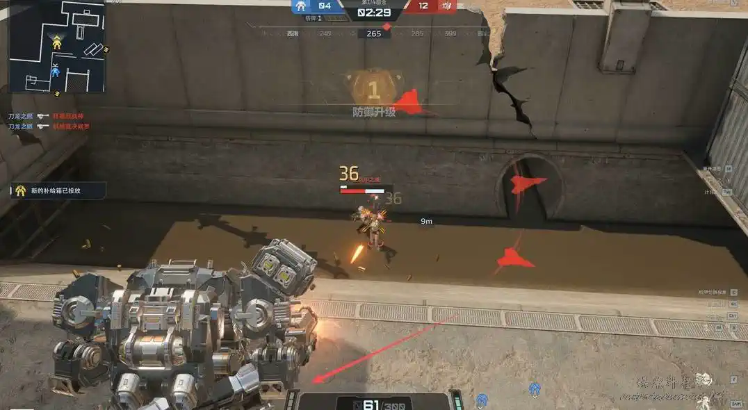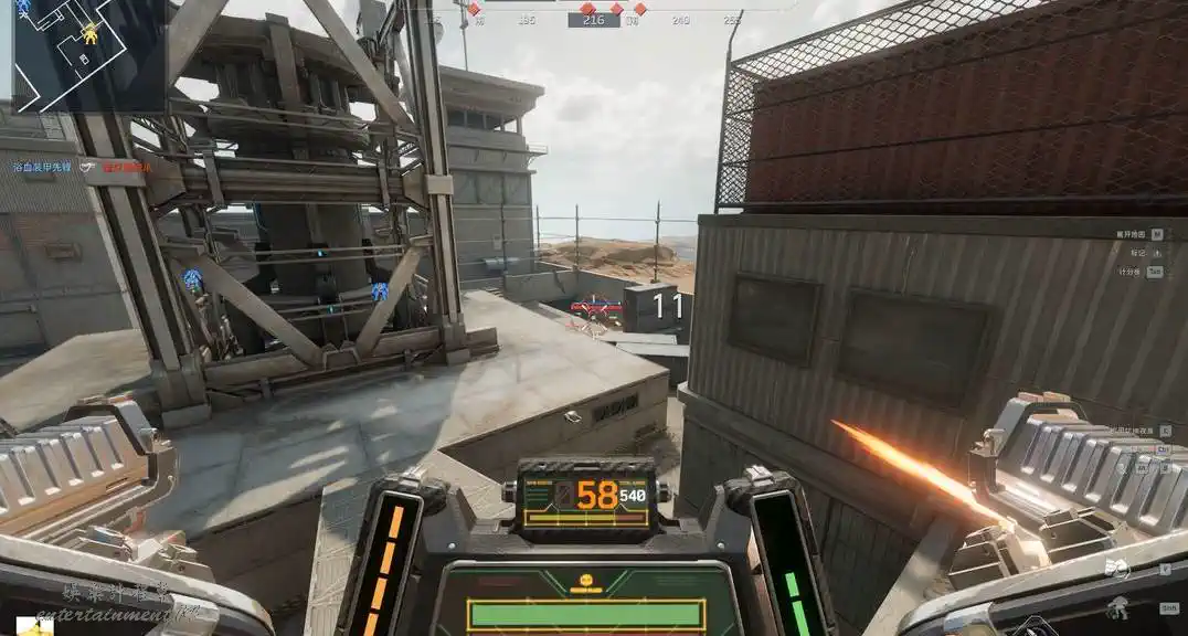 這裡有幾個集裝箱,一方面處於敵人復活點後,如果敵人專注打正面的機甲,那來到這裡就可以偷敵人的背身,即便敵人來集火,這裡還有集裝箱可以抵擋傷害,使用衝刺能與敵人進行周旋,完成反殺。