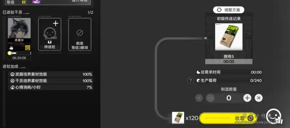 製造艙:安排幹員入駐,可加速產出角色經驗、武器經驗素材。