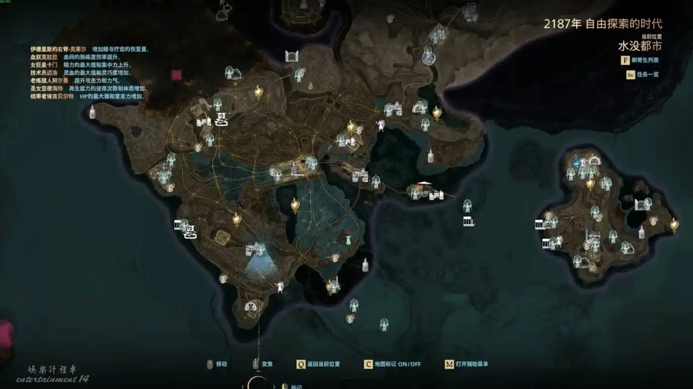 水沒都市,先走主線直到喬茜入隊,探索變電所之前可以考慮清大地圖發育一波,然後一路推主線直到提示前往都市東南方的電視塔,到這個階段整個水沒都市基本都可以開展探索了,是直奔主線打完輪回落胤拿前期輪椅噬血禦太刀還是地毯式搜刮大地圖各位請便,打完輪回落胤後也會開放自由探索時代,不影響在過去探索。總的來說,遊玩思路應該是主線和大地圖探索兼顧,打主線是因為有些區域需要主線引導時才能去(提前去跑白趟),而按照地圖標識去探索大地圖又有非常可觀的成長收益。