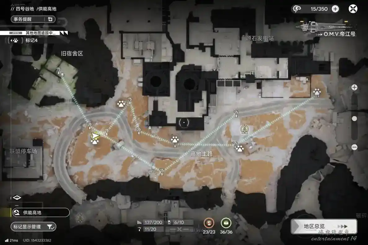 野生牙獸僅會在四號谷地的樞紐區與供能高地的谷地生成,且單次一般是3只一批(即3塊獸肉),以下為本人常用的採集點(獸爪標記)。
