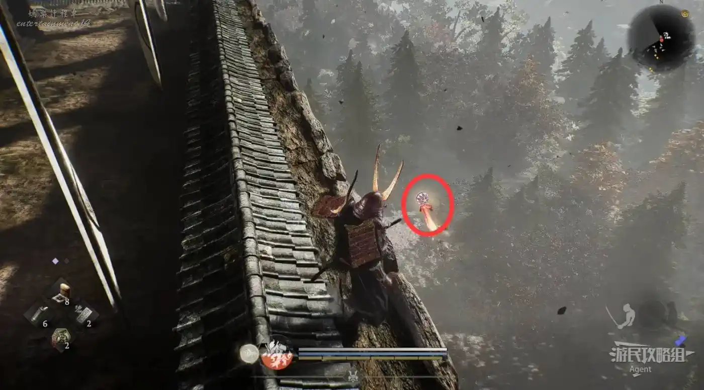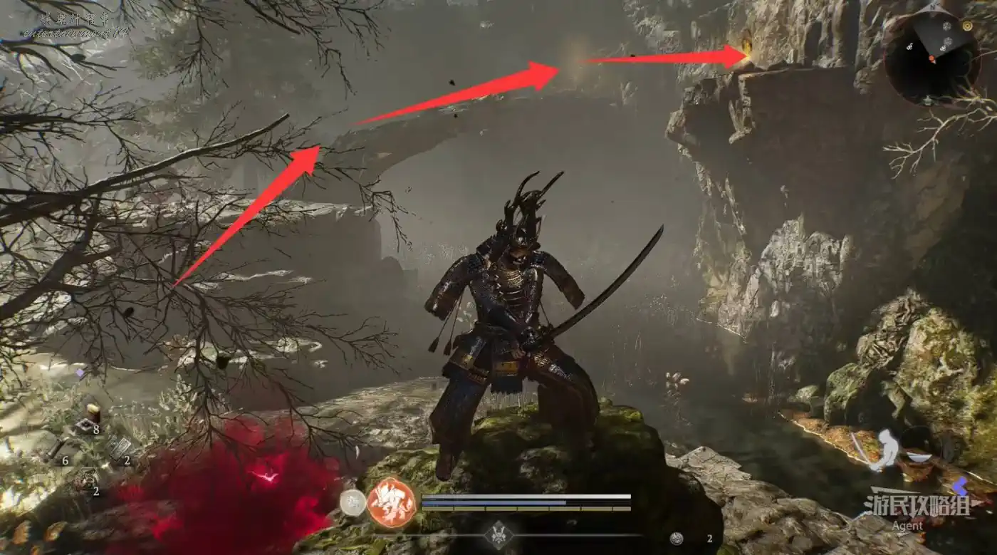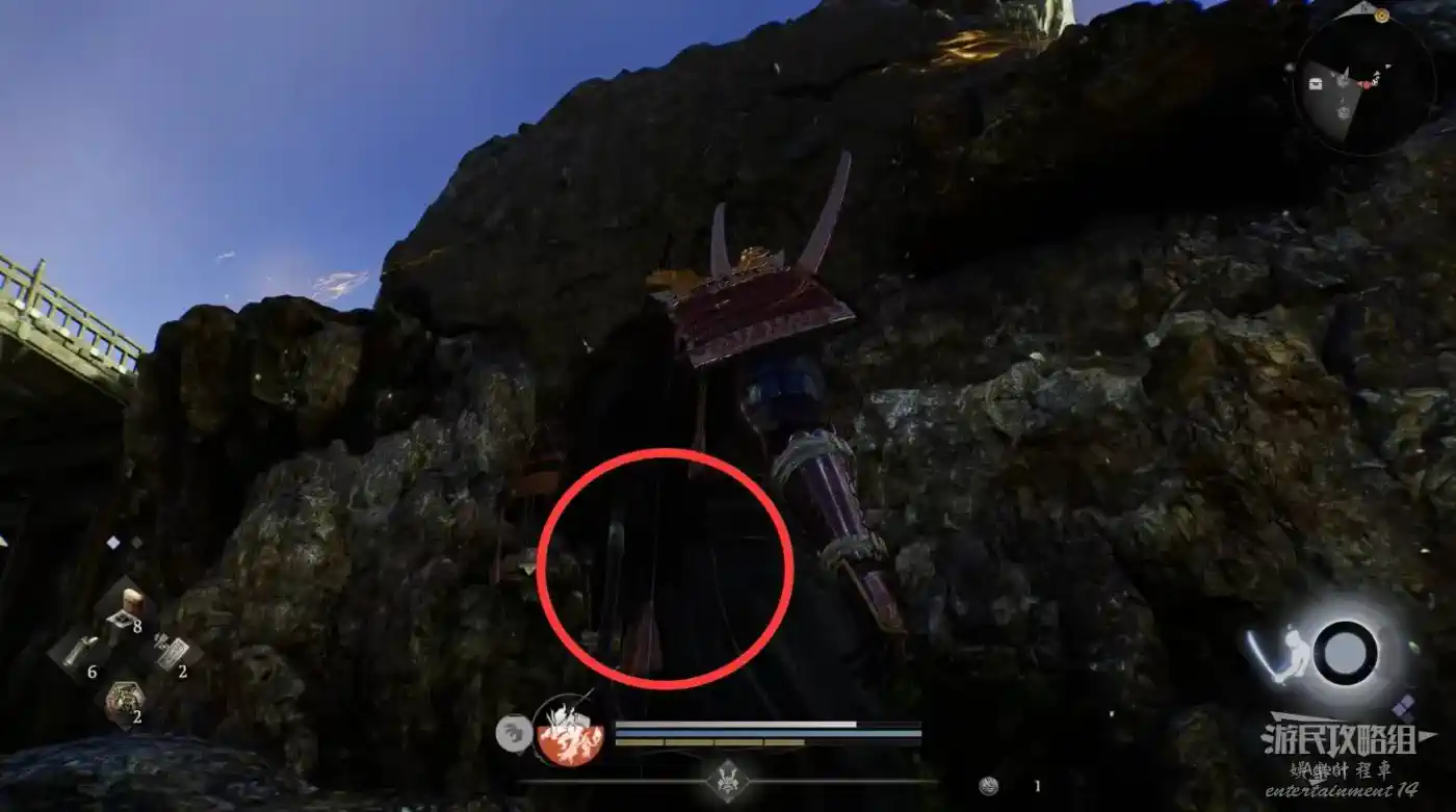 到濱松驛站下圖位置,橋頭的【靈脈】現在可以通過了,蹬牆過去拿到精華。