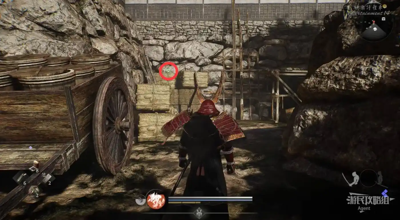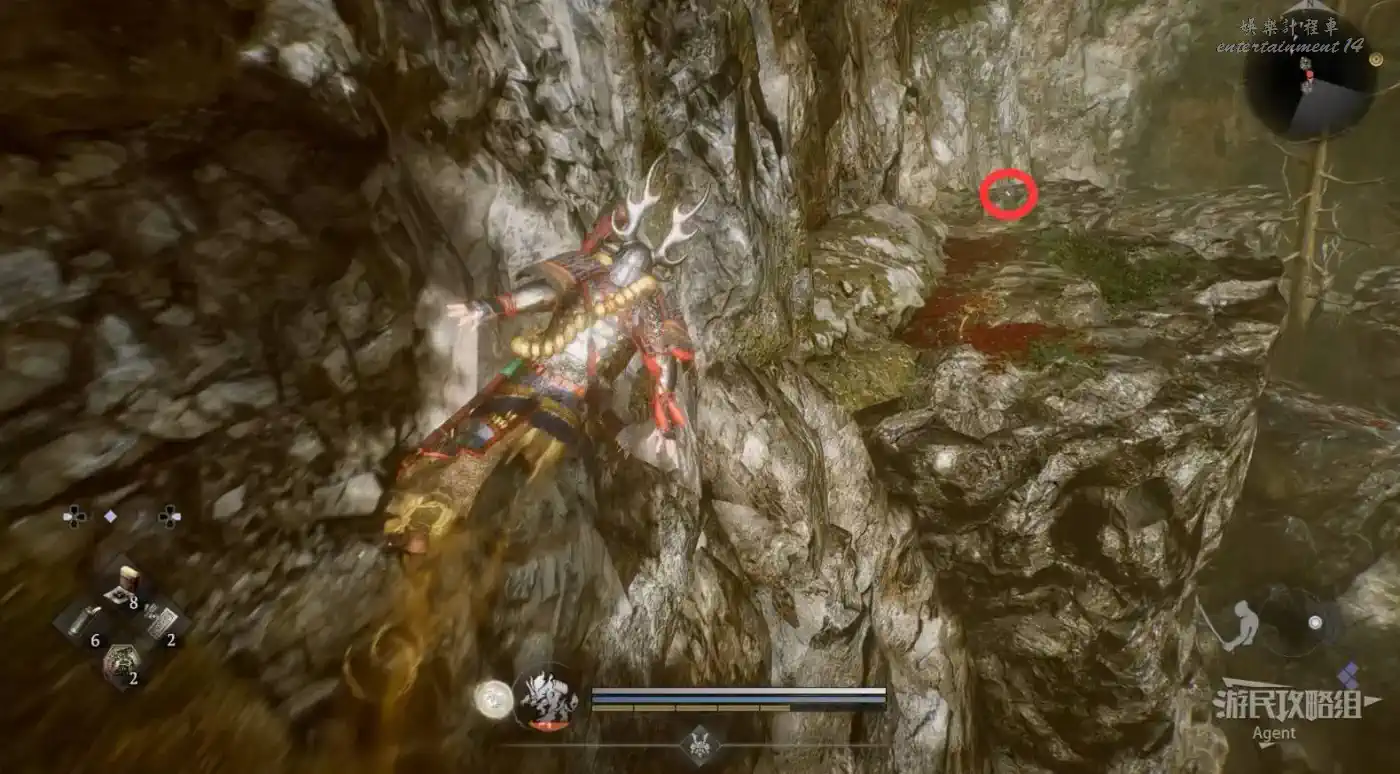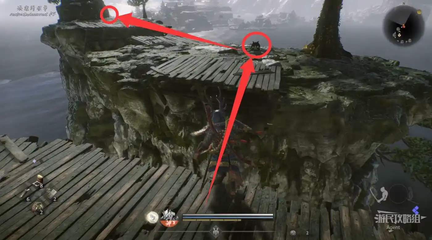 到濱松驛站下圖位置,橋頭的【靈脈】現在可以通過了,蹬牆過去拿到精華。