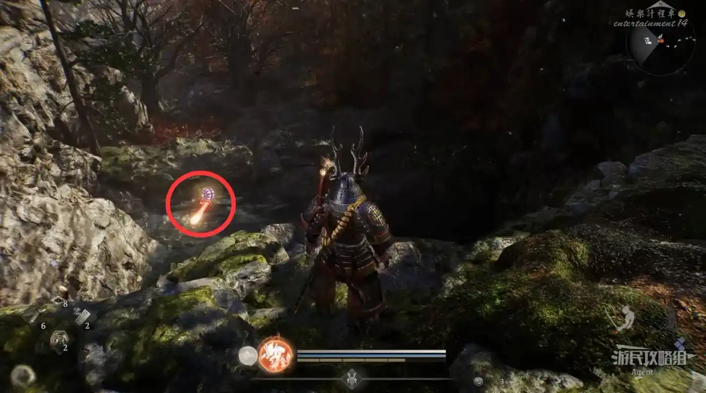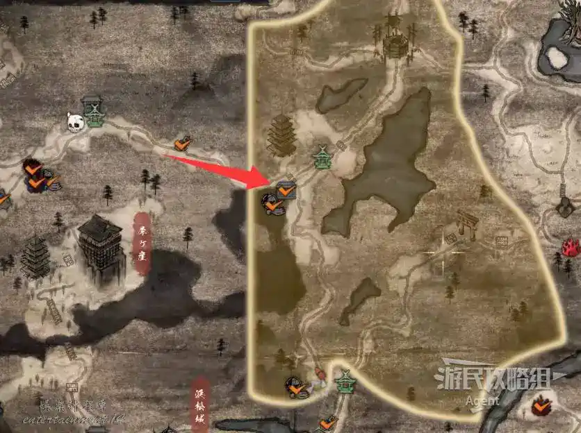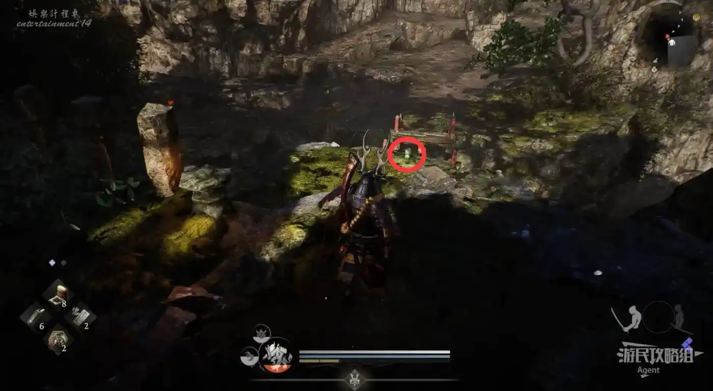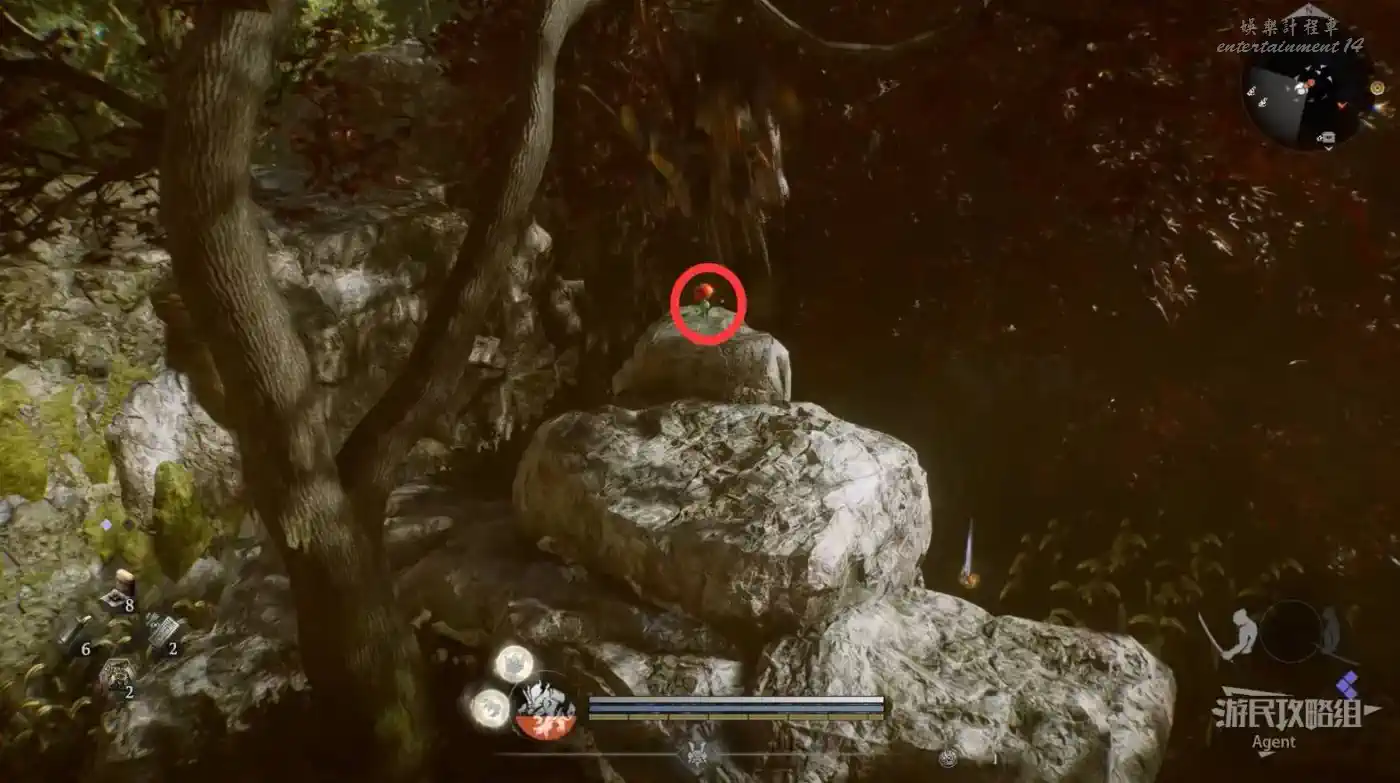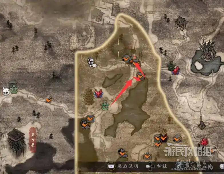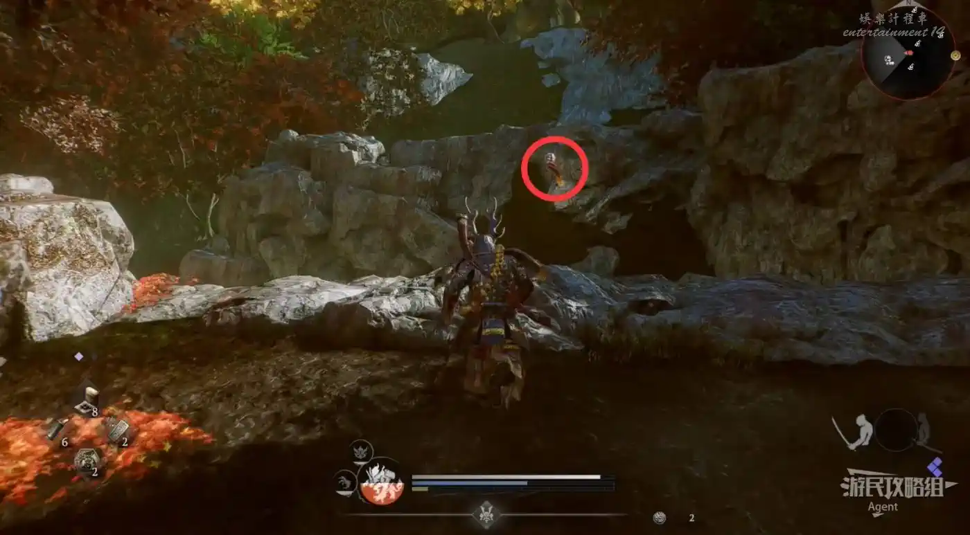 到最北面啟動大紅葉三叉路神社,在下圖圈出位置遇到神秘忍者,接到奇譚任務“生存於暗影者”。