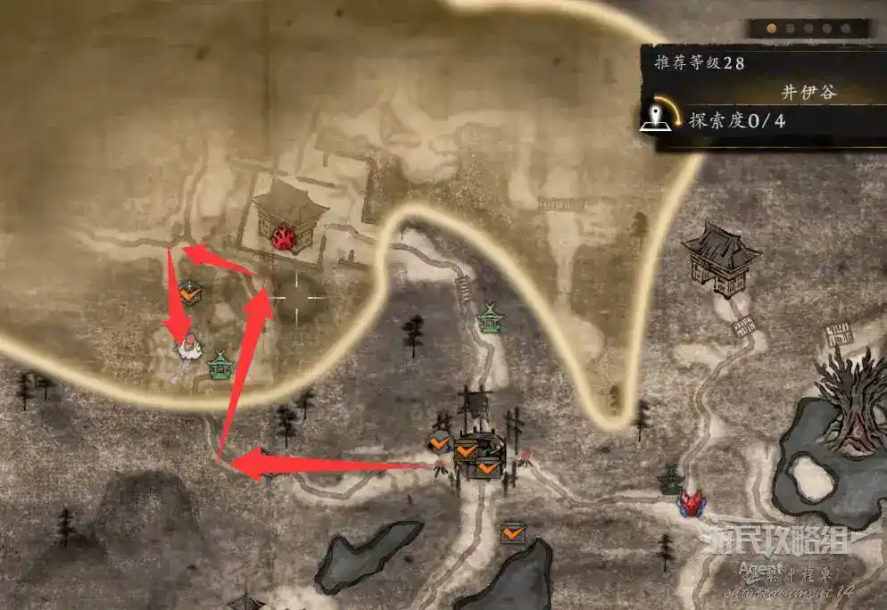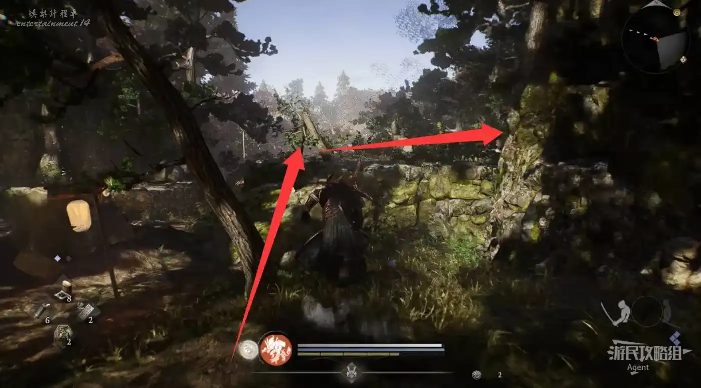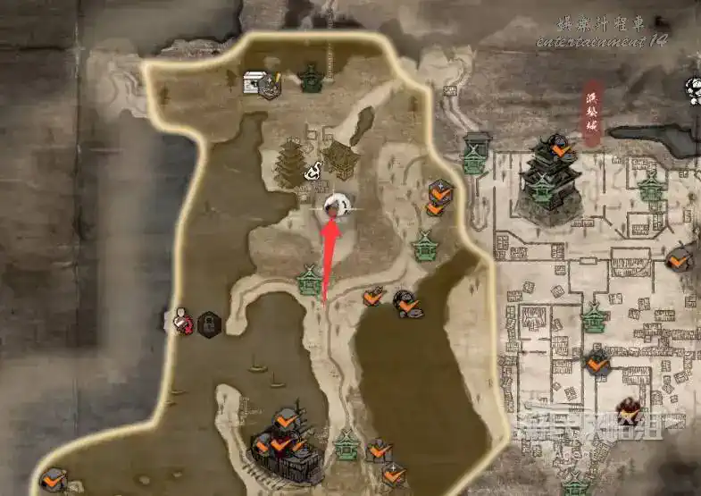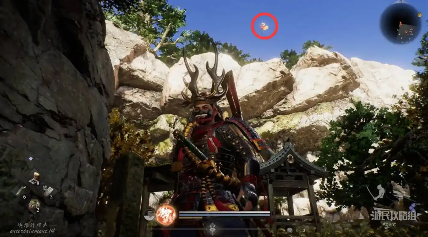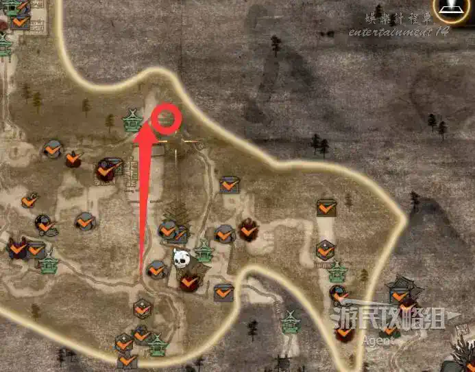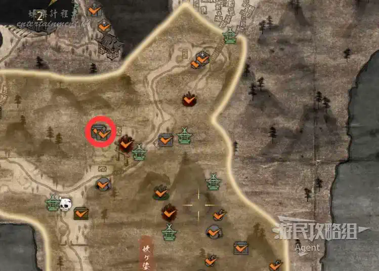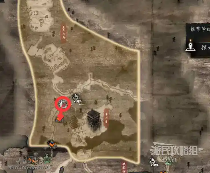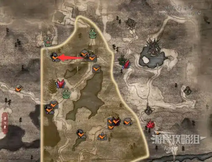 到最北面啟動大紅葉三叉路神社,在下圖圈出位置遇到神秘忍者,接到奇譚任務“生存於暗影者”。