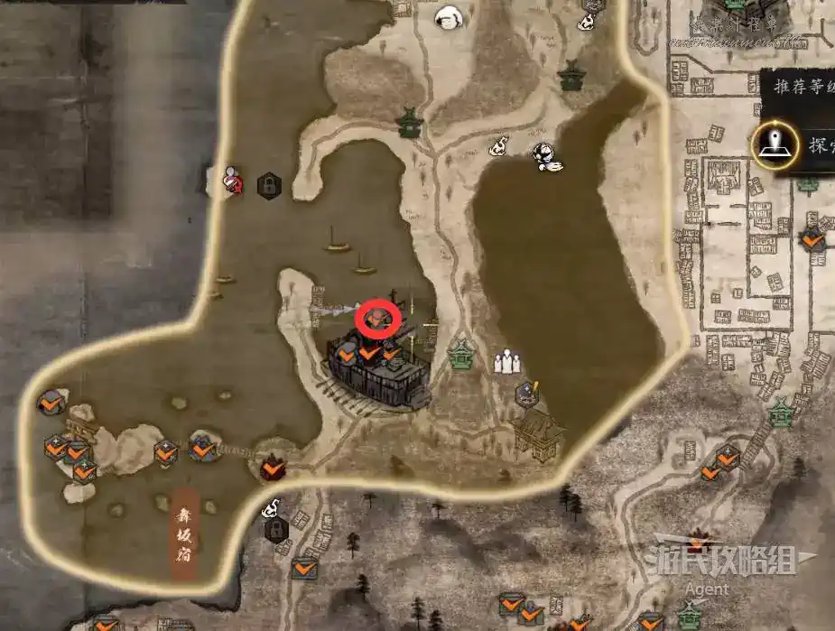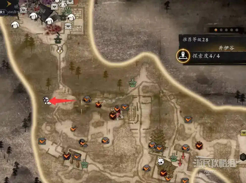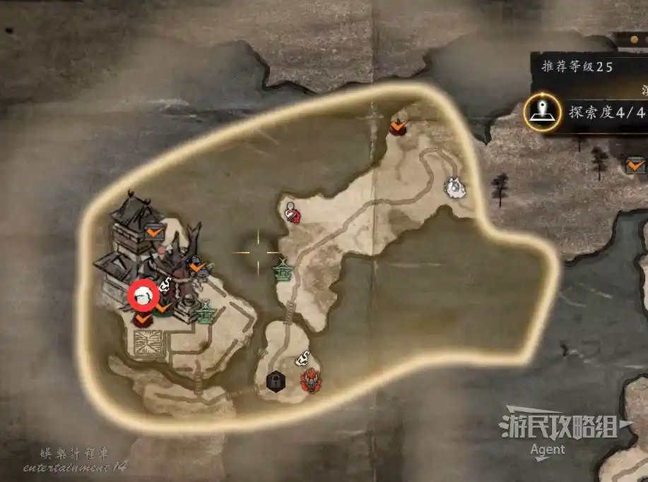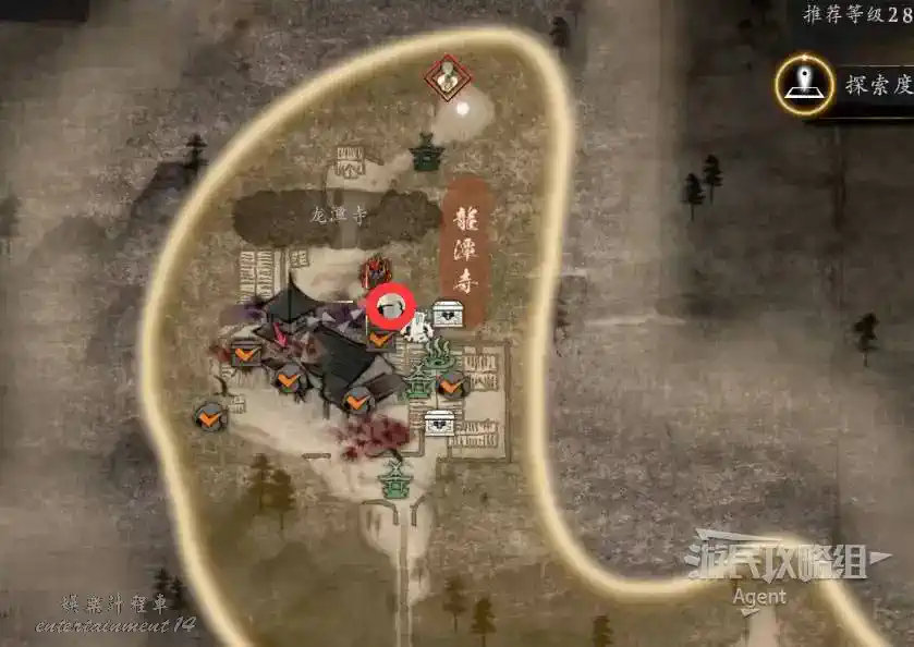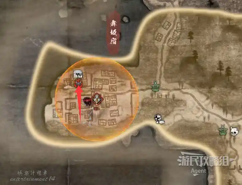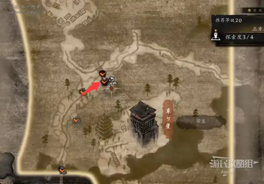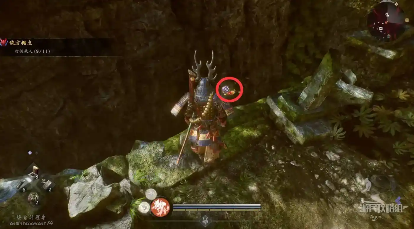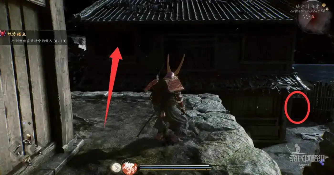 到最北面啟動大紅葉三叉路神社,在下圖圈出位置遇到神秘忍者,接到奇譚任務“生存於暗影者”。