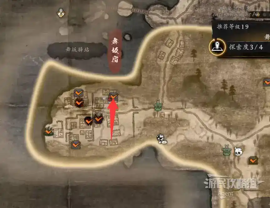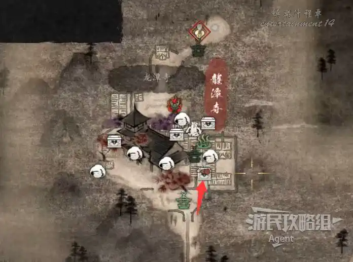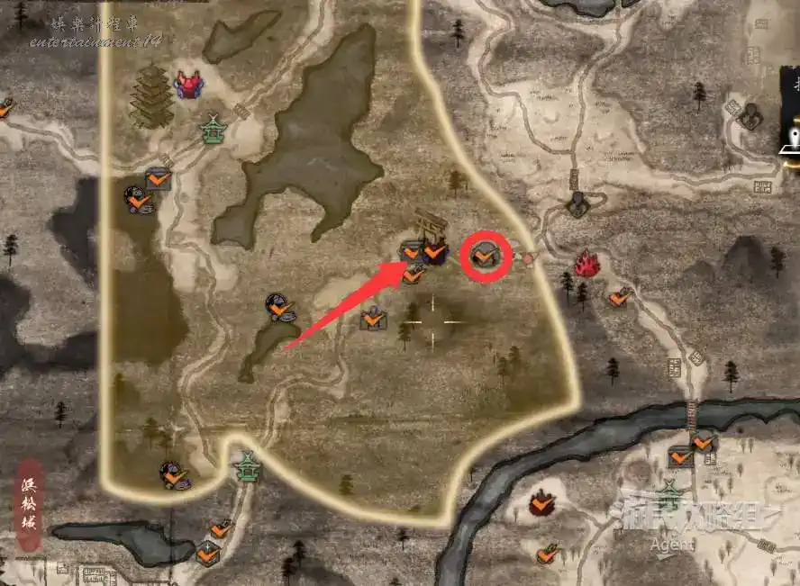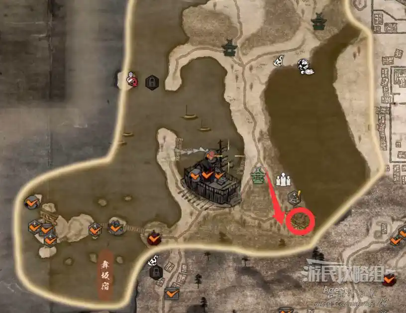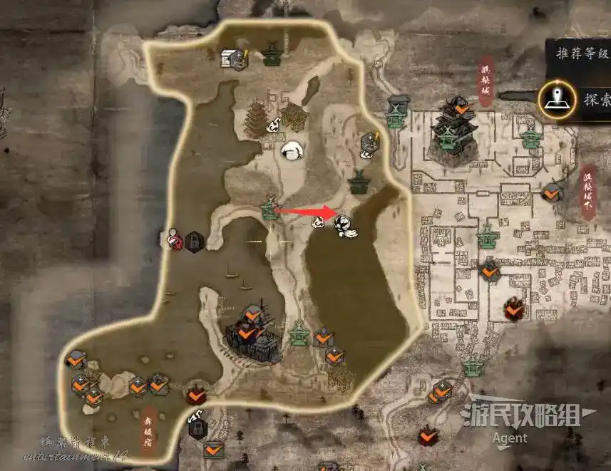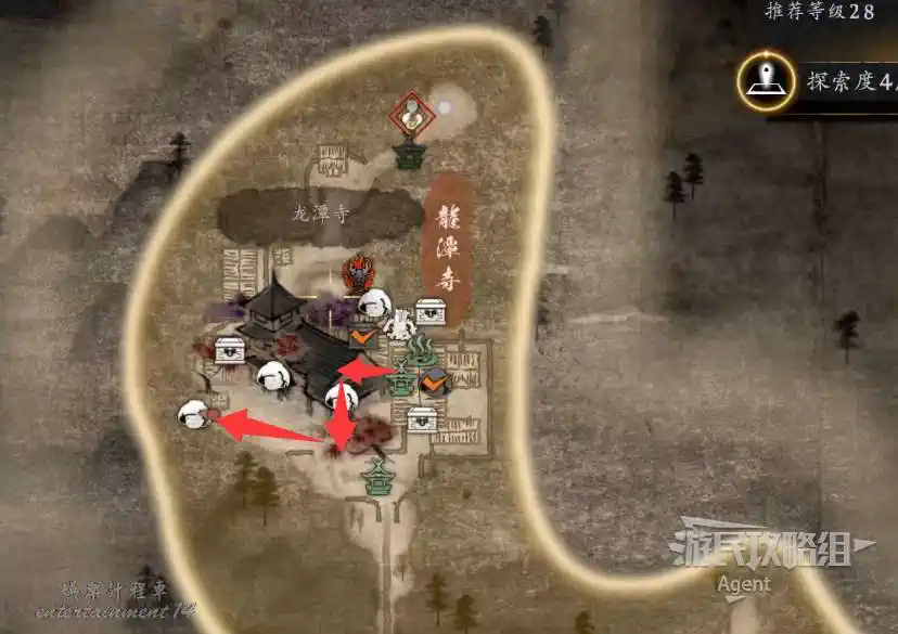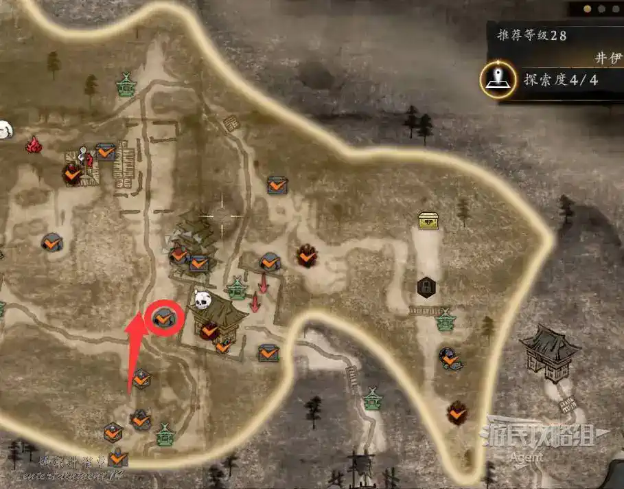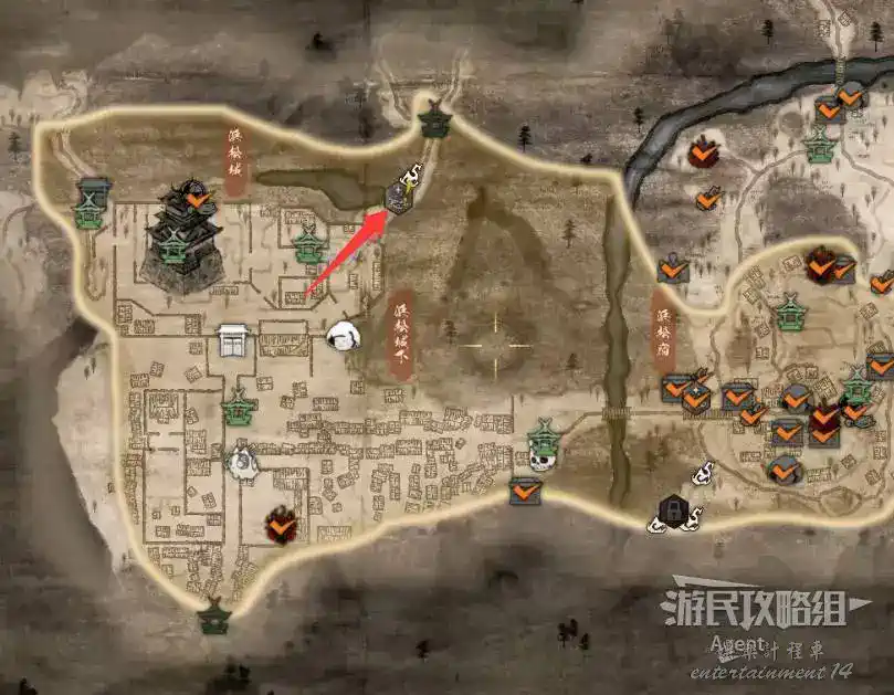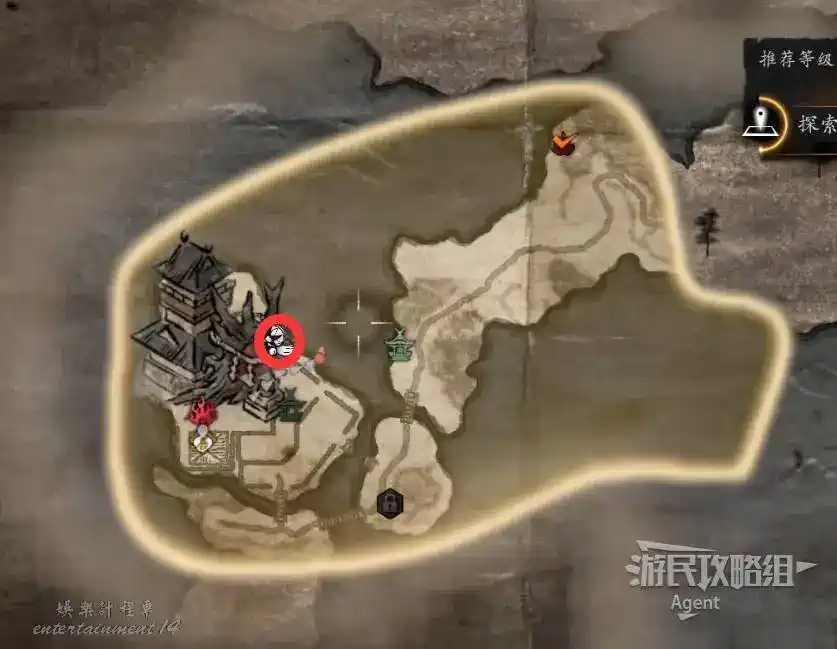 到最北面啟動大紅葉三叉路神社,在下圖圈出位置遇到神秘忍者,接到奇譚任務“生存於暗影者”。