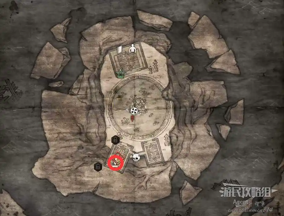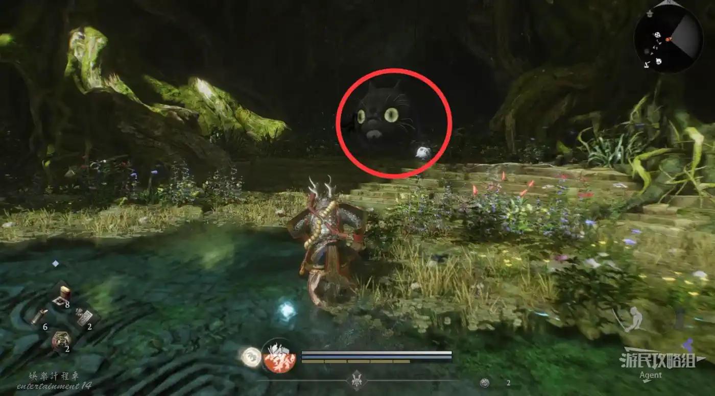 往西穿過小地獄,在斷橋橋頭遇到只【善擦】。因為橋斷了無法通過,它會帶你走小路抵達島上的山頂,途中會經過三個靈脈。