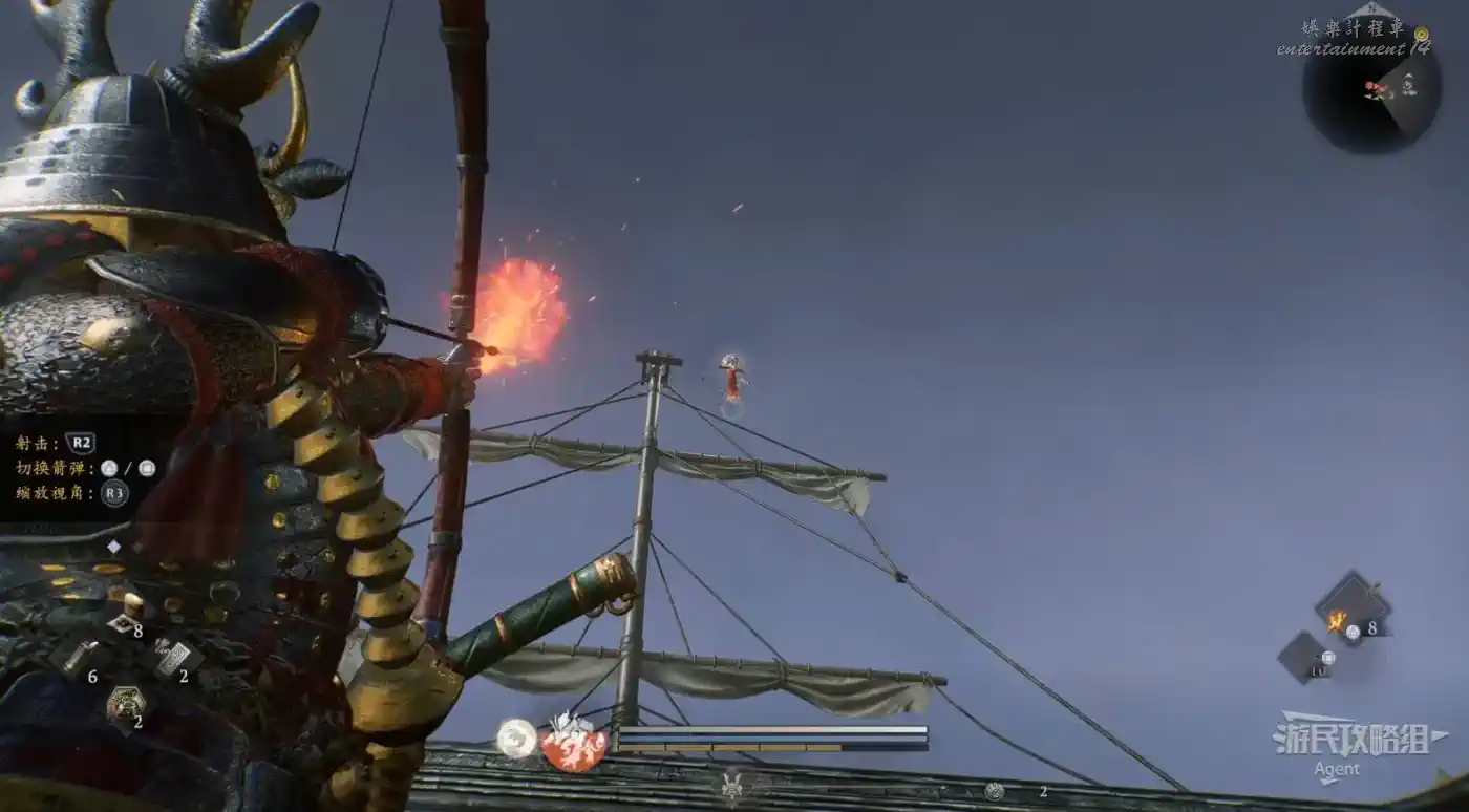 遊戲設計不太好,弓箭的角度比較難把握,可嘗試射火箭,我就是這麼沾到它尾巴的。