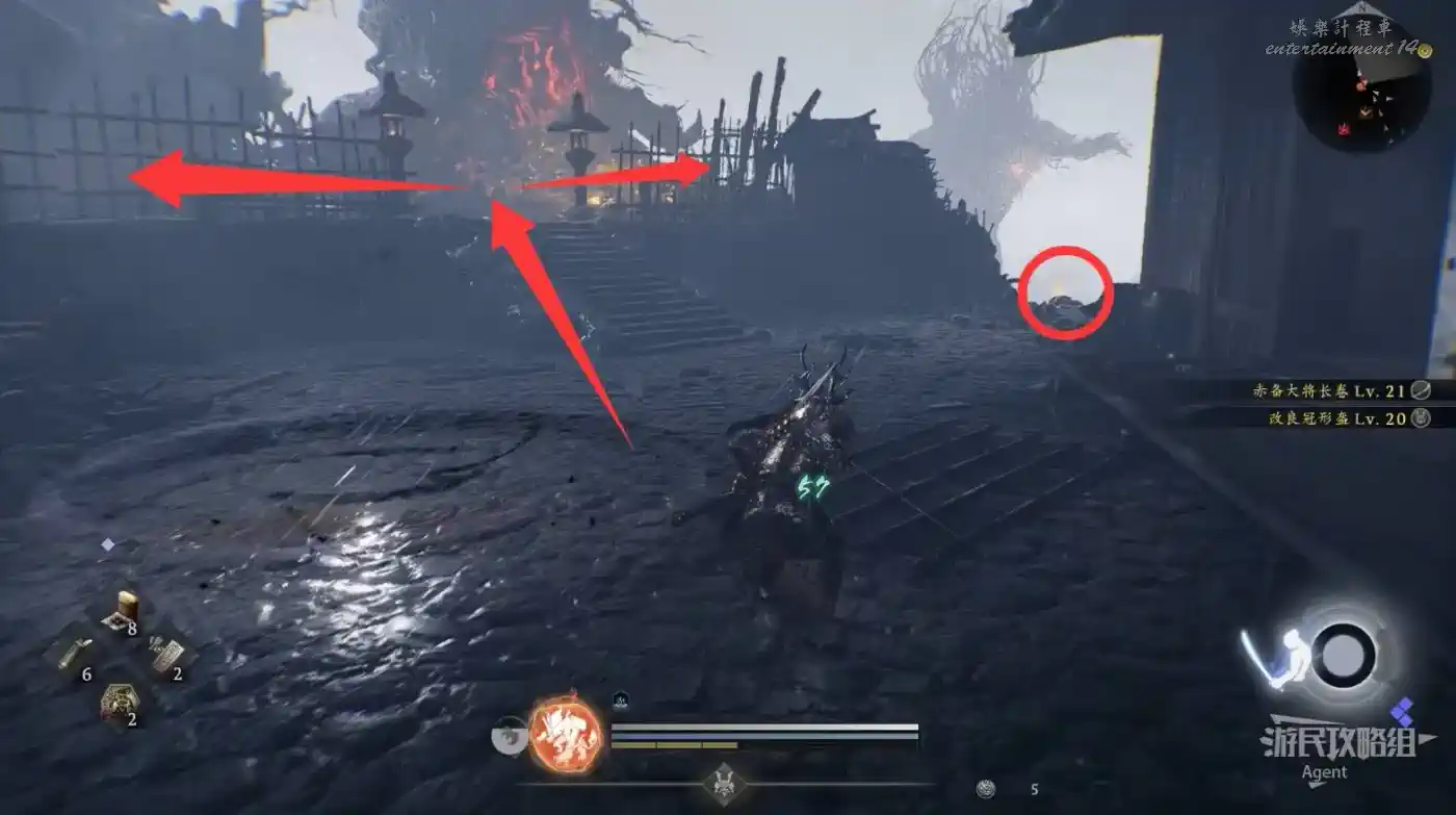 往西來到大銀杏參道,正門打不開,從側邊繞進去消滅所有敵人,然後從裡面把正門打開。