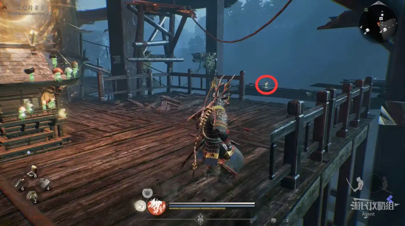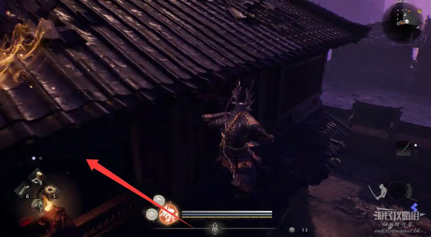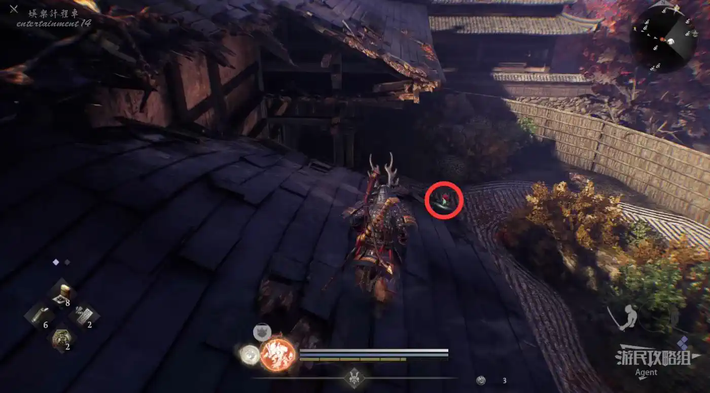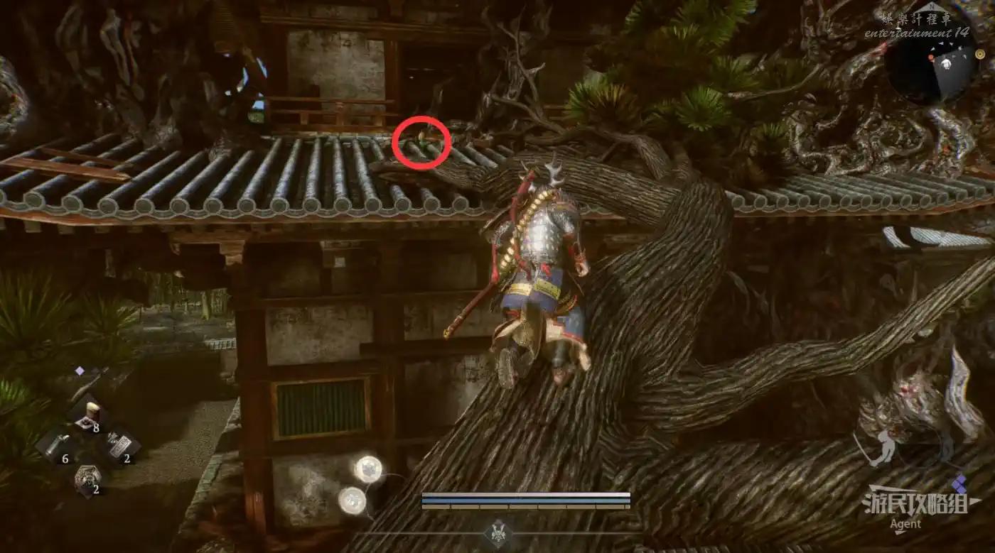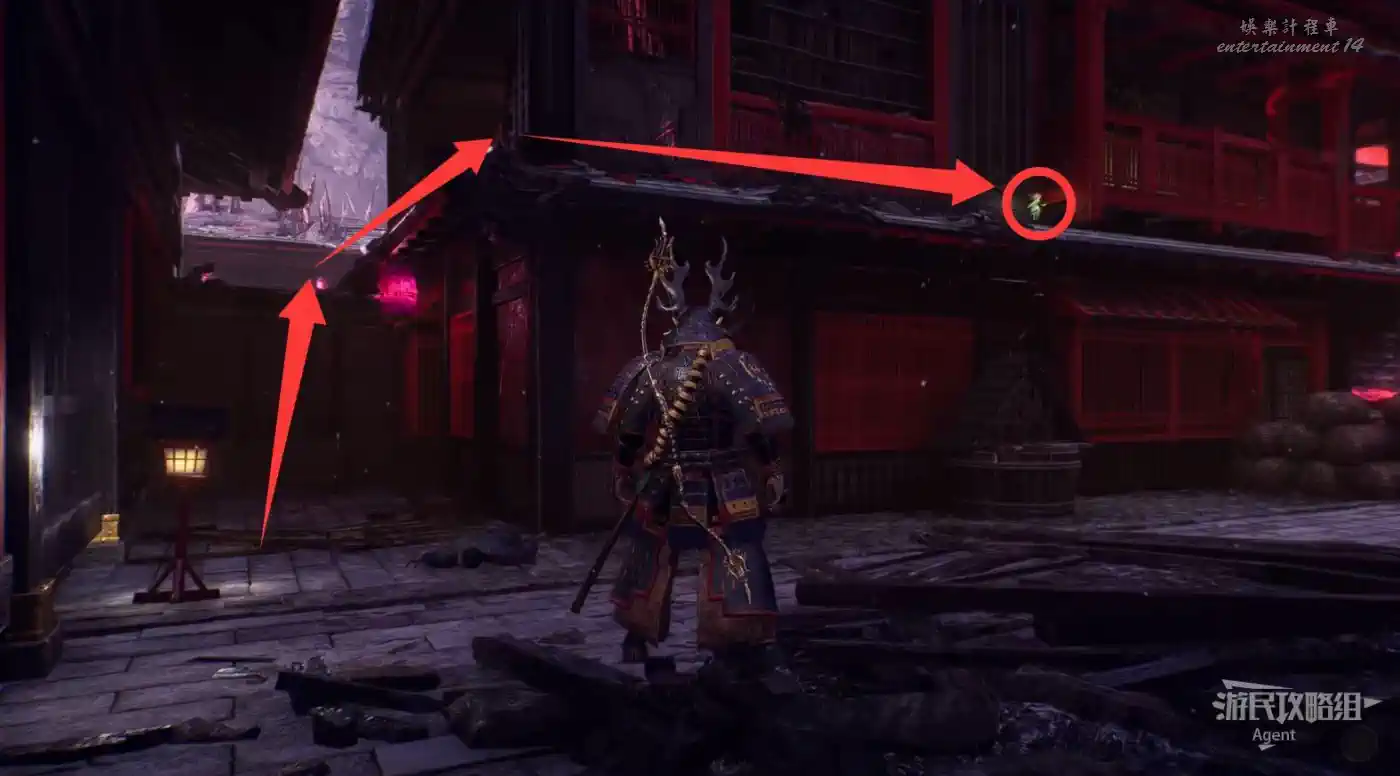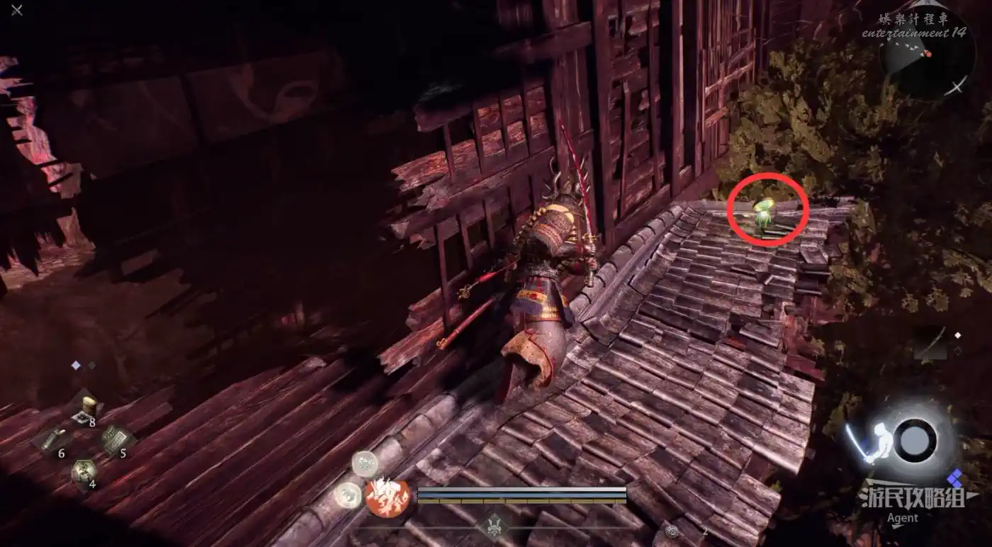 1、來到濱松驛站,搜刮中心街道兩側的房子,從下圖位置跳上房頂有只【木靈】。