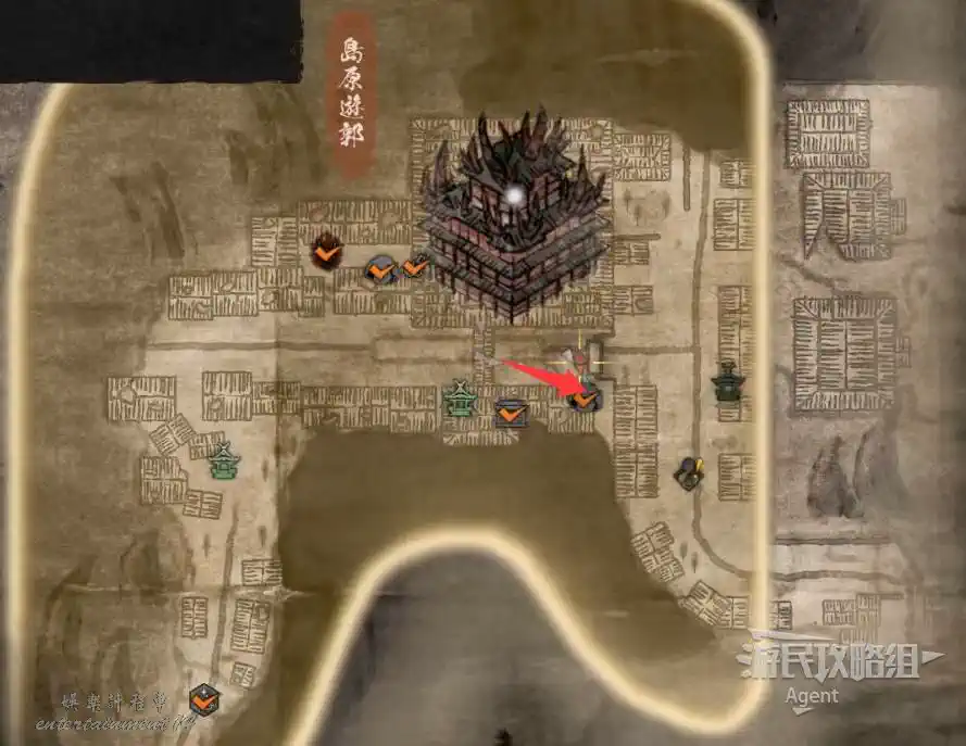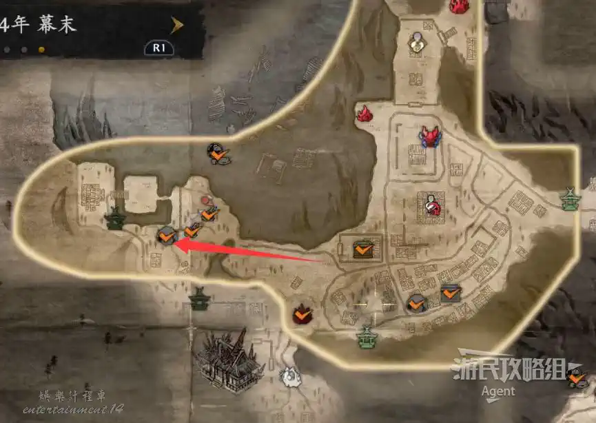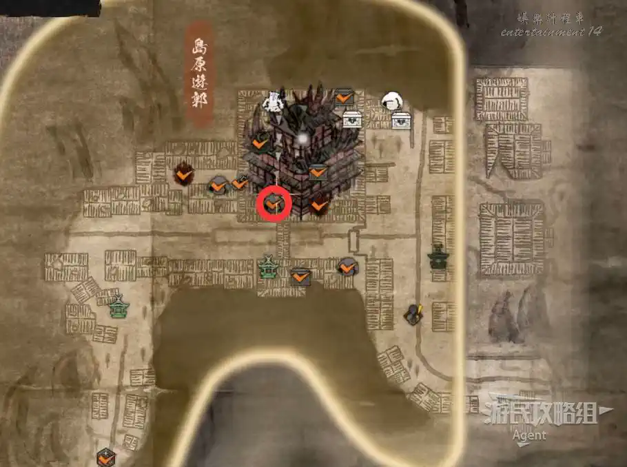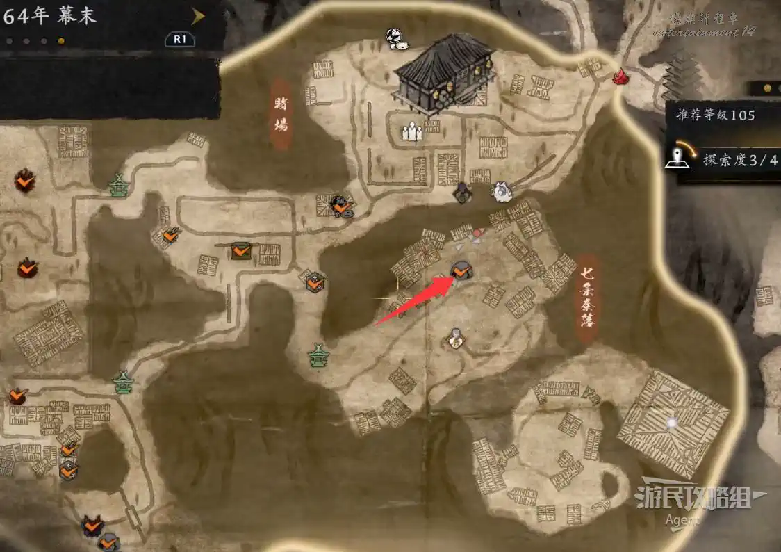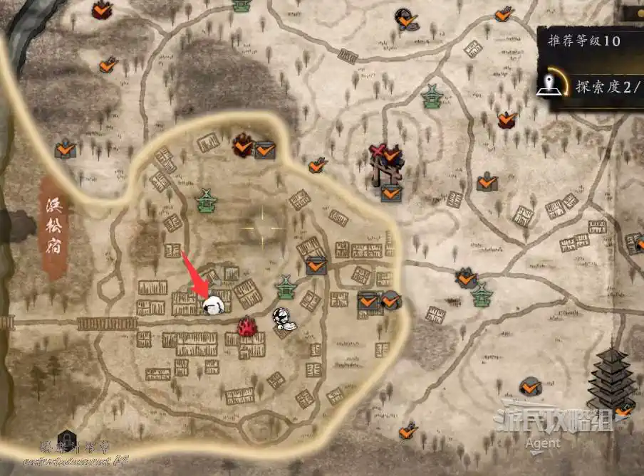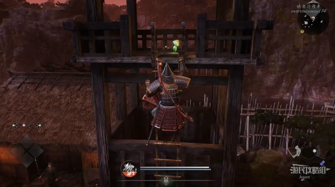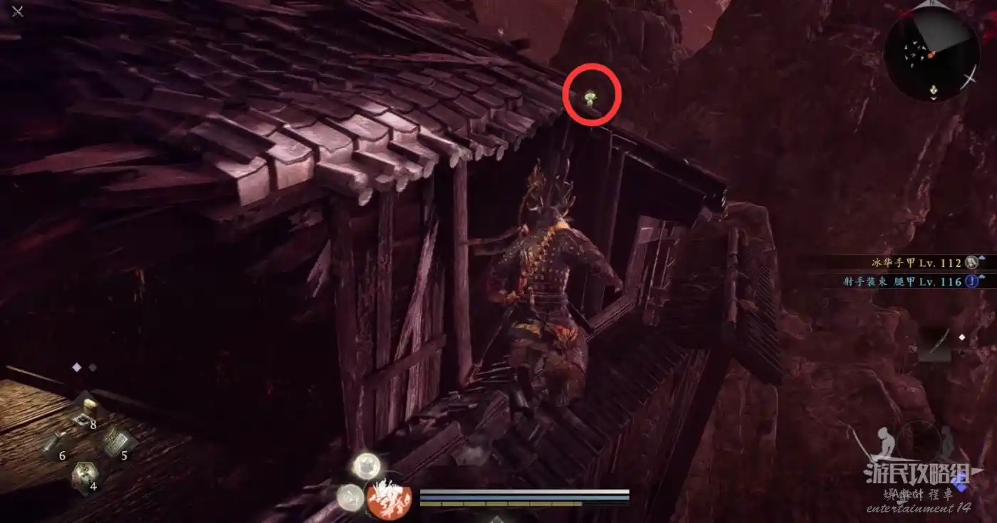 1、來到濱松驛站,搜刮中心街道兩側的房子,從下圖位置跳上房頂有只【木靈】。