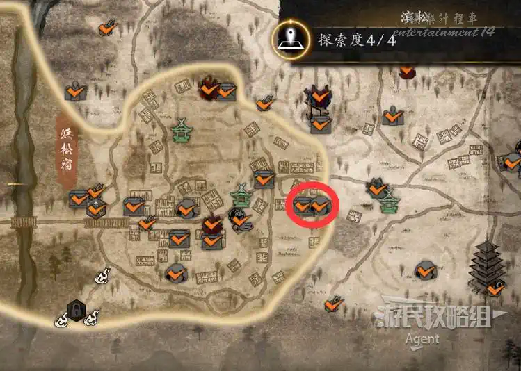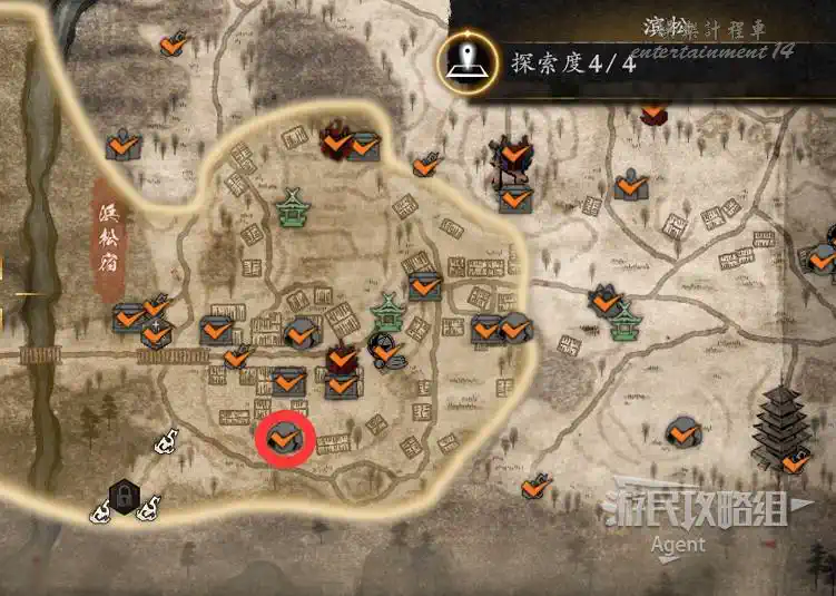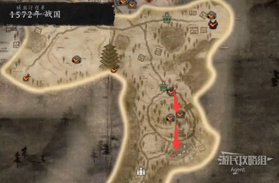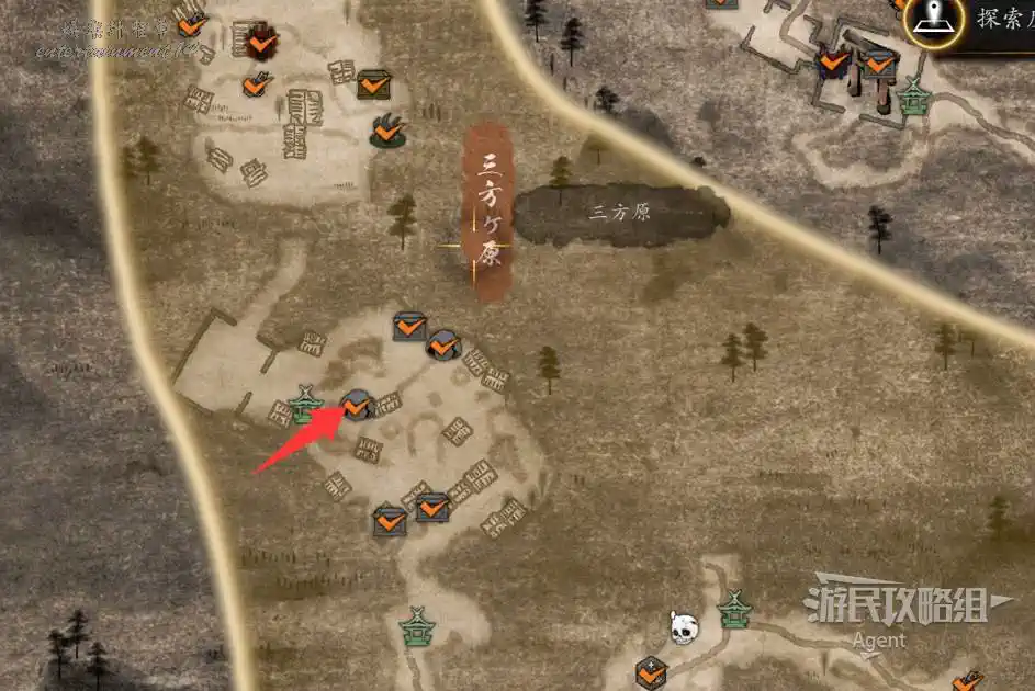 到濱松丘陵的三方原分岔口,地圖上畫著塔的據點之前進不去,現在有鑰匙可以開門了。