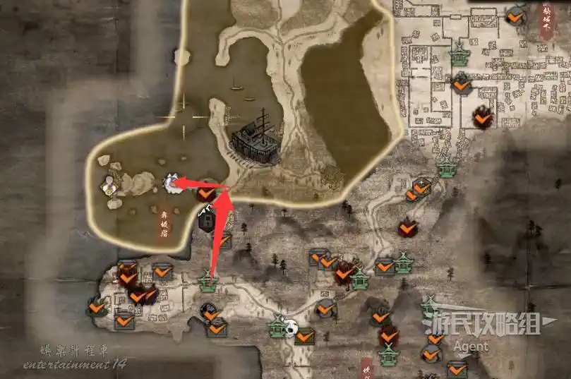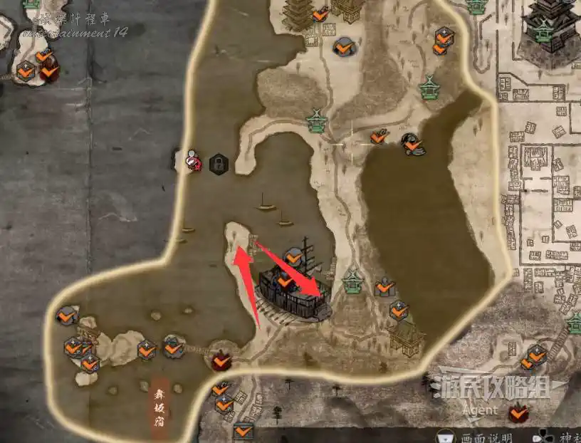 2、在地圖上看到只大船,先啟動附近的湖畔神社,然後從碼頭經過多個小船,登上大船。