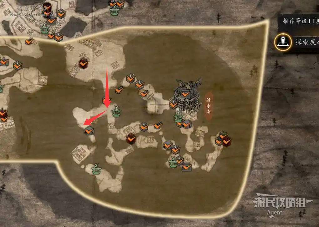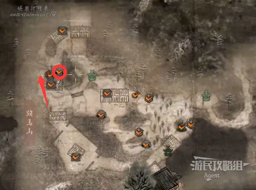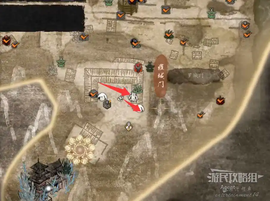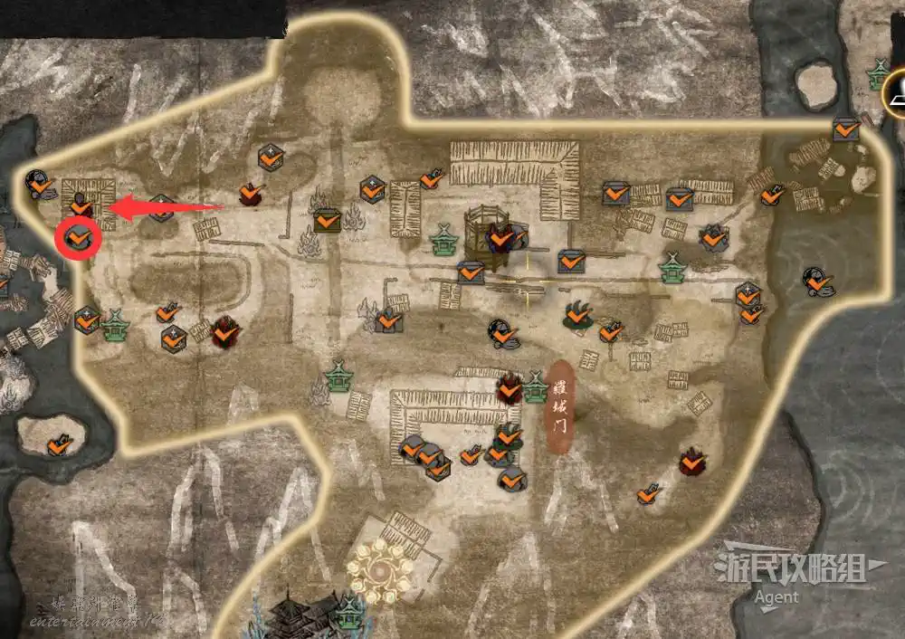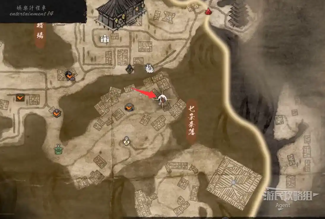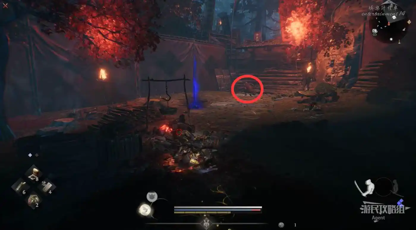 1、在下圖位置擊敗強敵血煙阿銀,旁邊房子角落有只【木靈】。