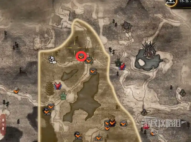 1、從二條城遺跡來到京都禦所,往北清除據點後,開東面的門出去有只【木靈】。
