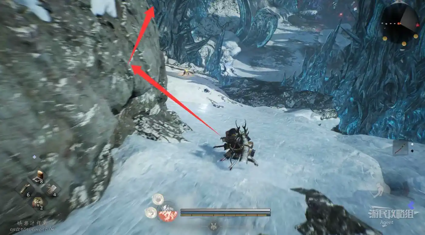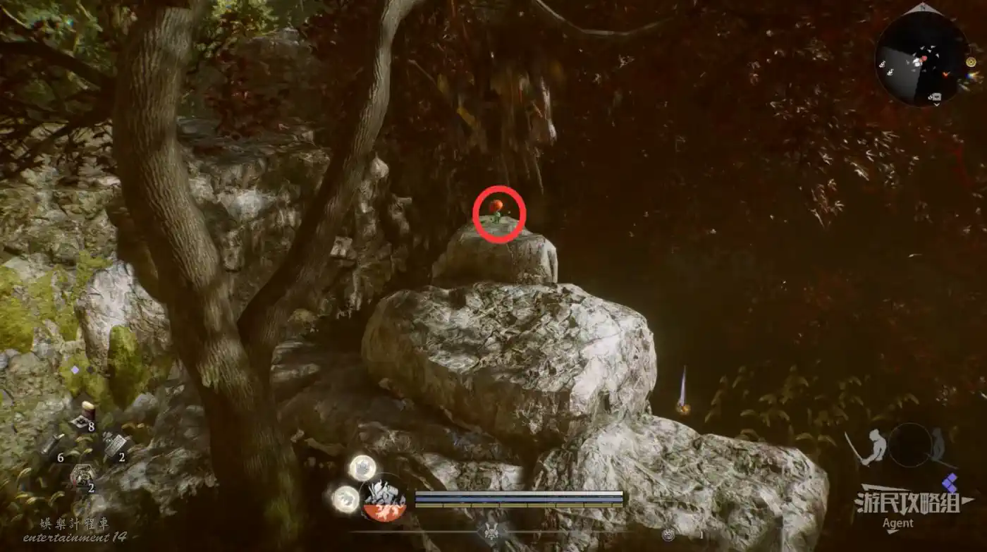 1、來到清水,找到溫泉後,推倒樹橋到下圖位置,高處有只【木靈】。