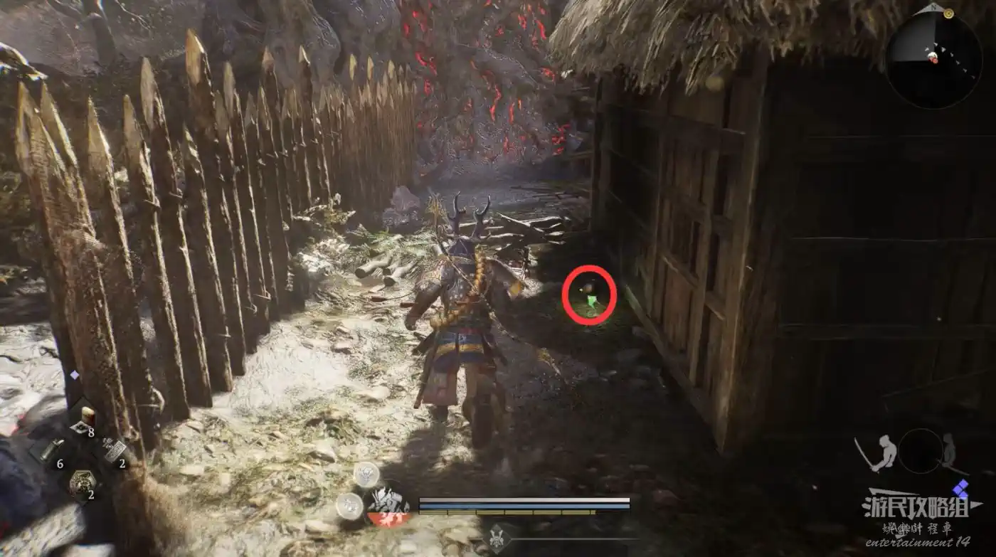2、搜刮村子裡的各個房屋,下圖位置房子後面有只【木靈】。