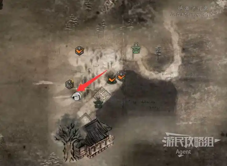 3、過橋後先不去左邊,去右邊走到頭,房頂上有只【木靈】。到房子下面可揭下泥牆的符紙。