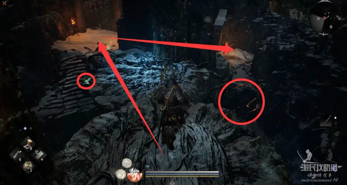 2、下圖位置有口井,一旁懸崖邊有個屍體提到井裡有異常,打掉井口的石頭,就會出現【木靈】。