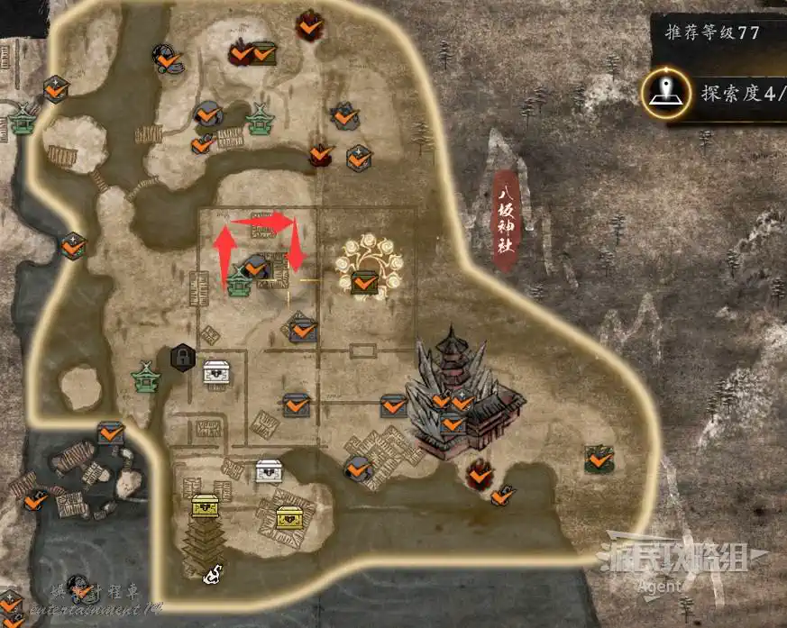 1、從七條大路遺址神社往南,清除據點後,房子裡有【木靈】和寶箱。