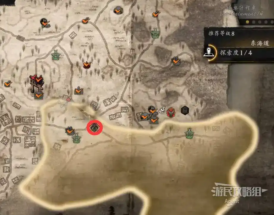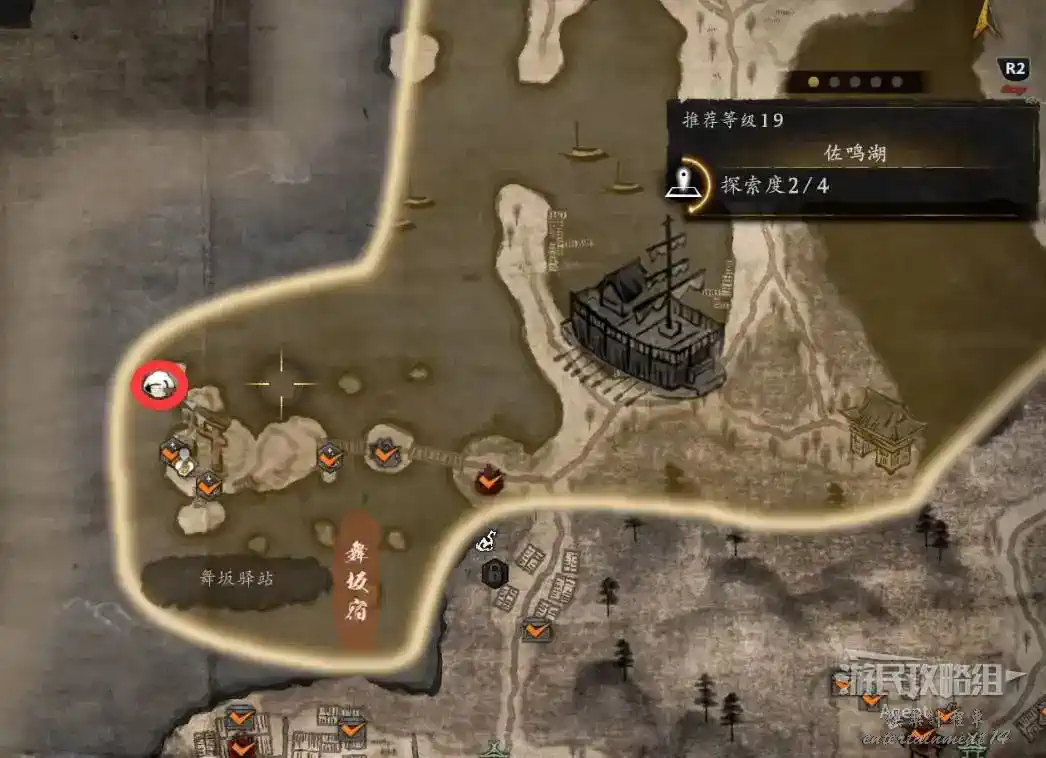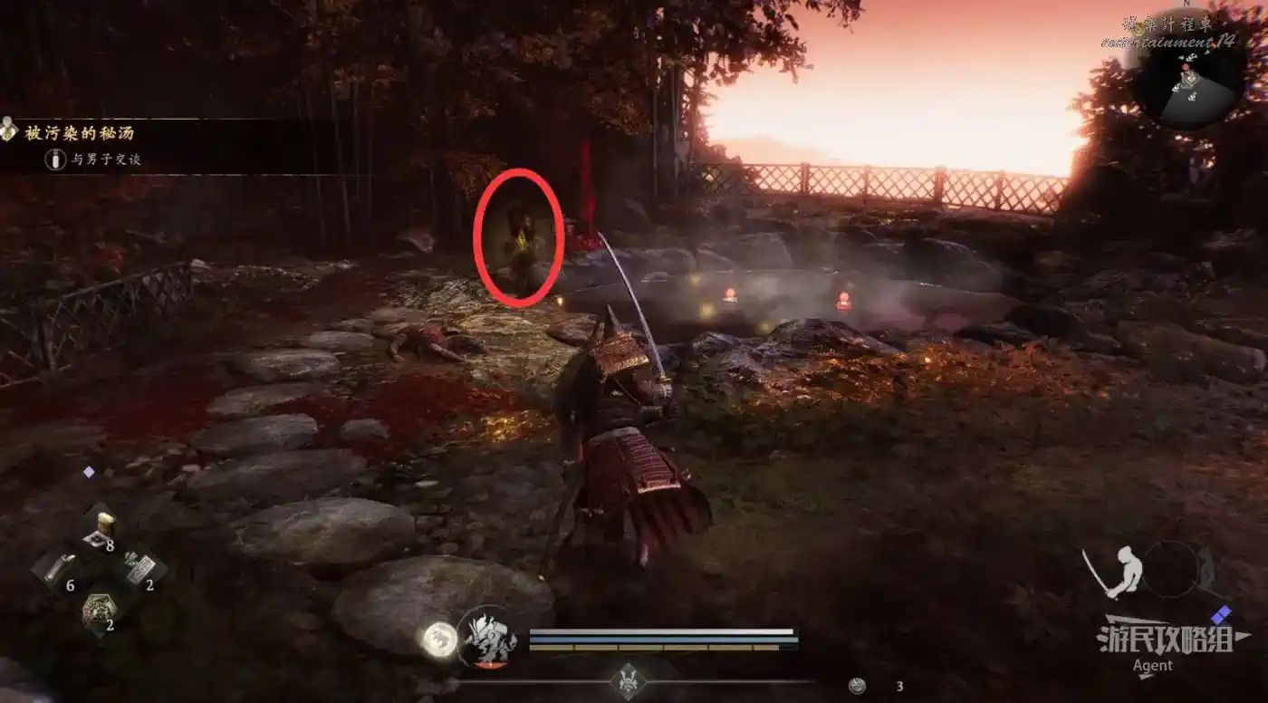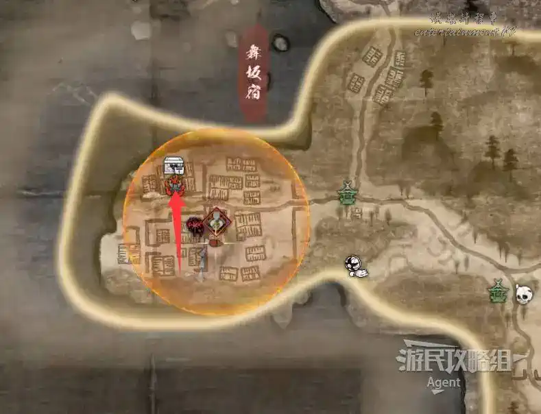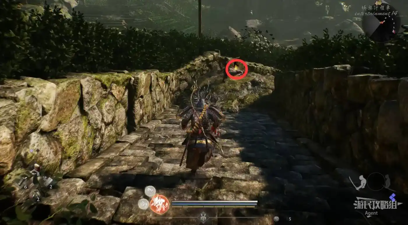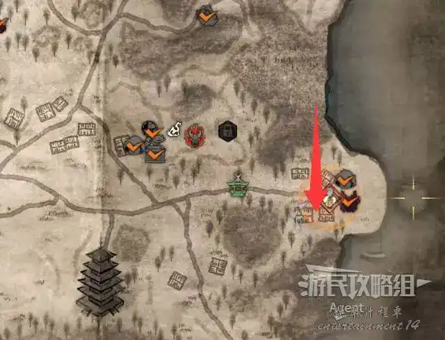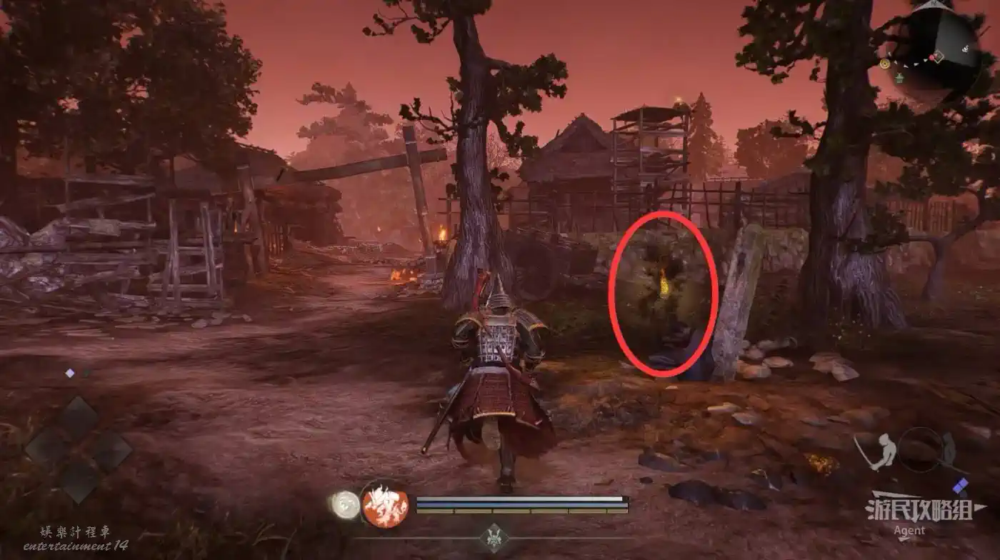 到井伊谷北部啟動大紅葉三叉路神社,在下圖圈出位置遇到神秘忍者,接到奇譚任務“生存於暗影者”。