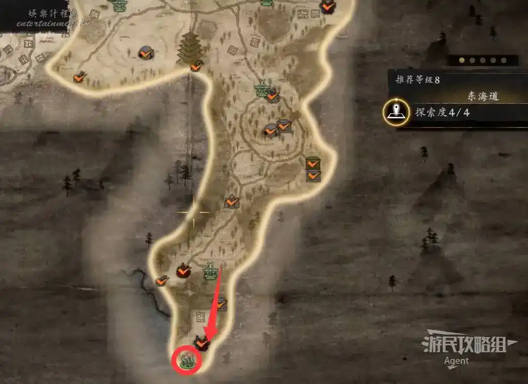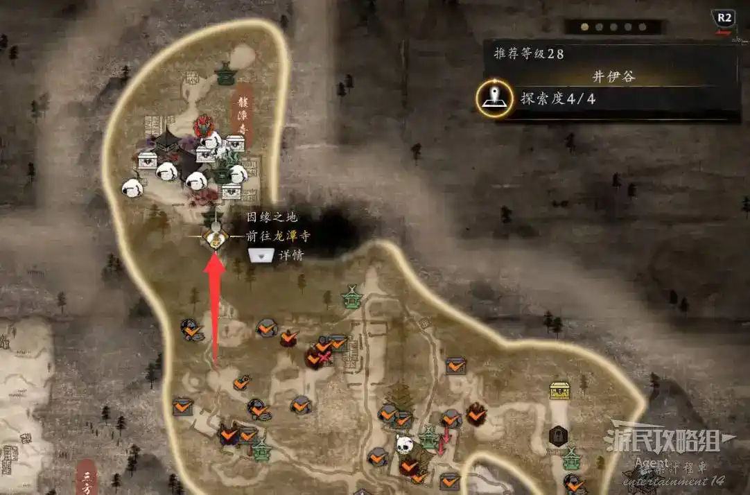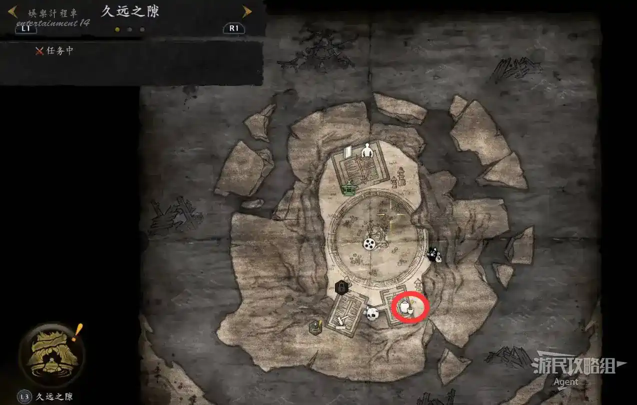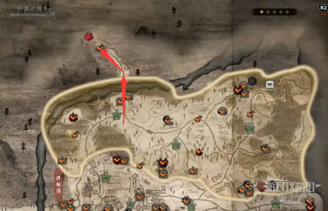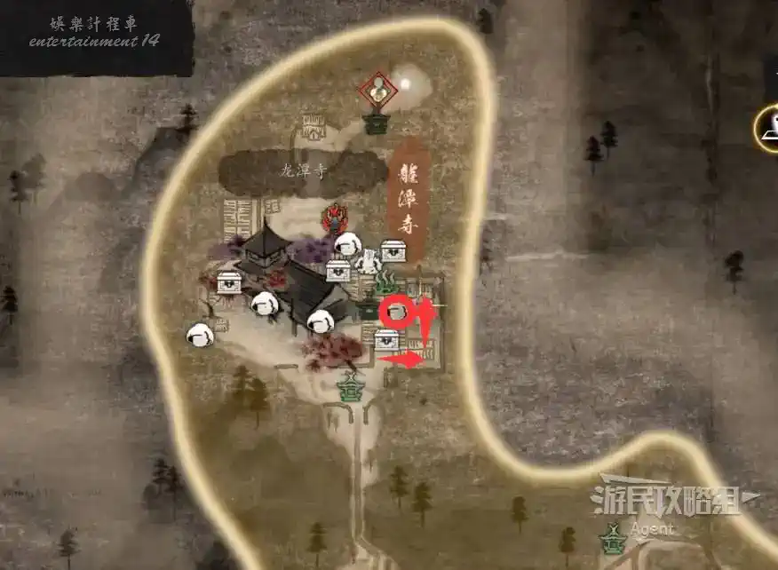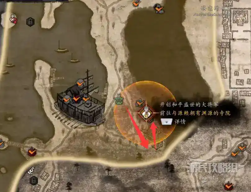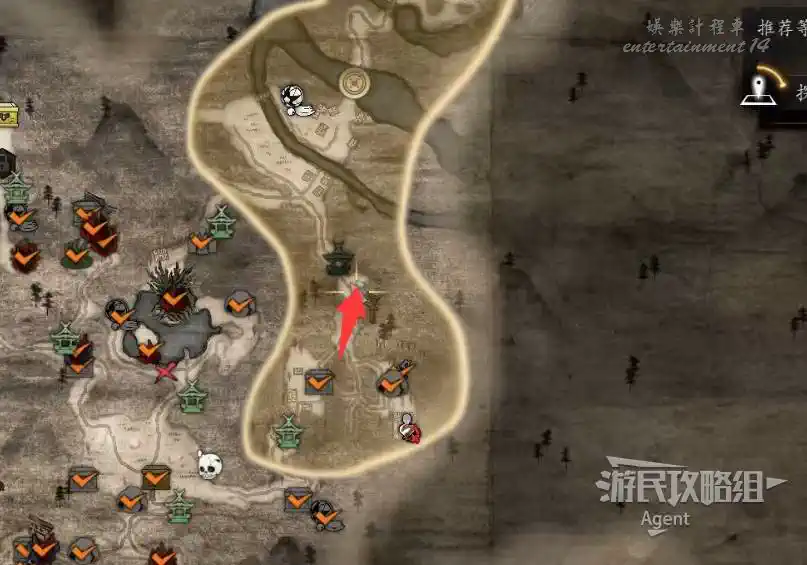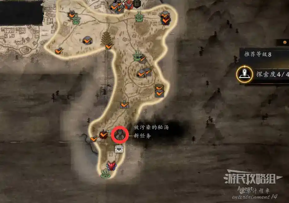 到井伊谷北部啟動大紅葉三叉路神社,在下圖圈出位置遇到神秘忍者,接到奇譚任務“生存於暗影者”。