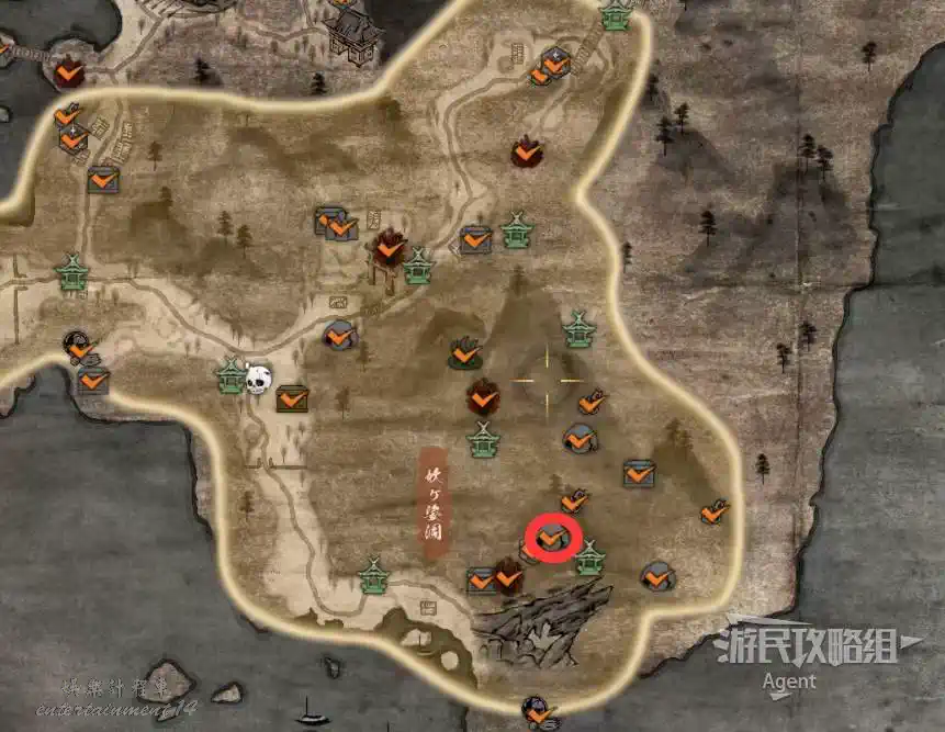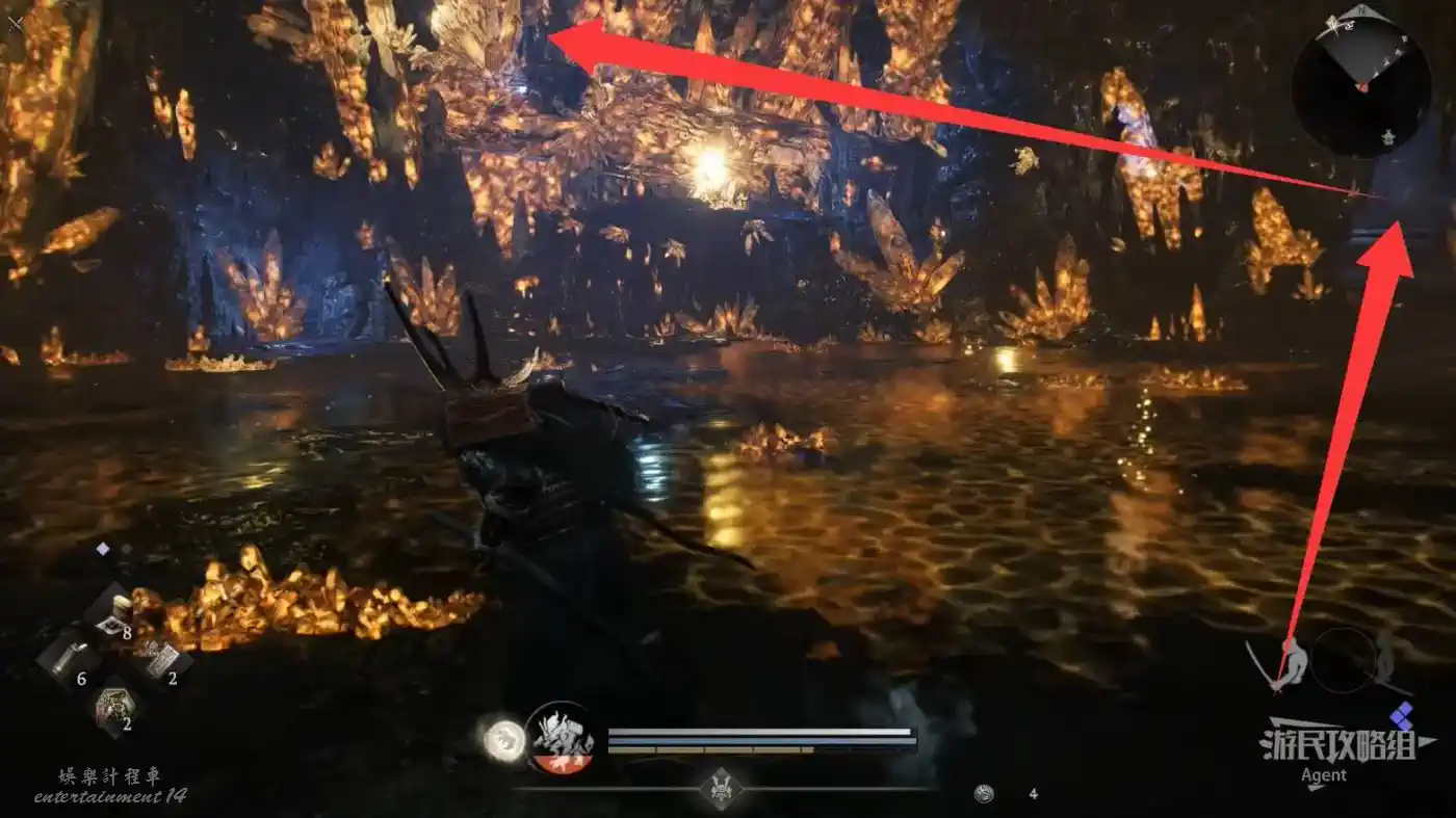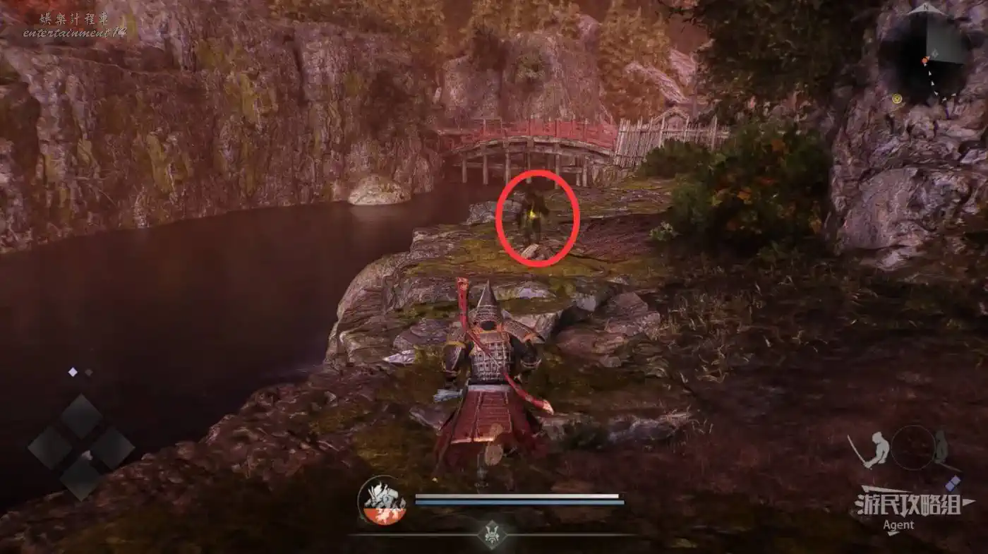 到戰國地圖西面的佐鳴湖,往西穿過小地獄,在斷橋橋頭遇到只【善擦】。因為橋斷了無法通過,它會帶你走小路抵達島上的山頂,途中會經過三個靈脈。
