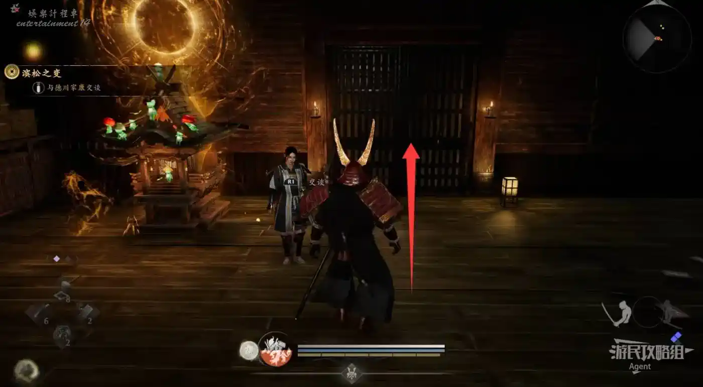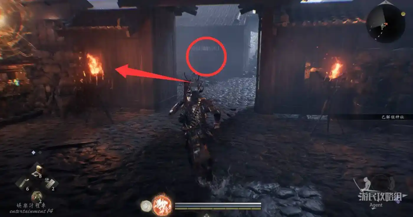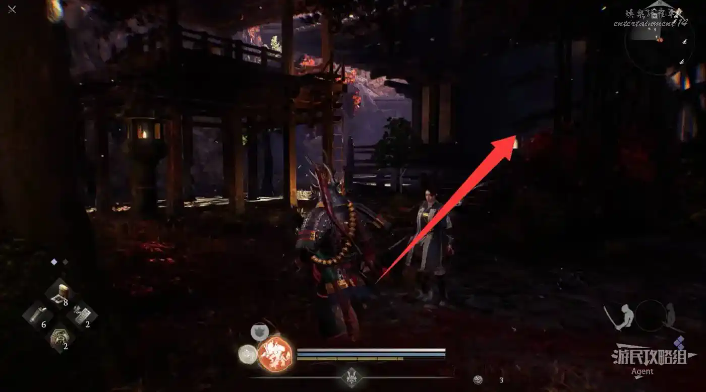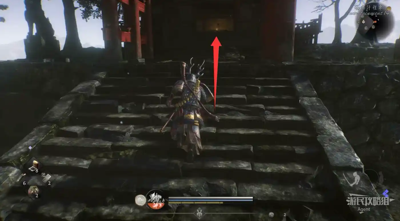 往北走,用廢棄神社鑰匙開門,和服部半藏的善擦“疾風丸”一起消滅怪物。