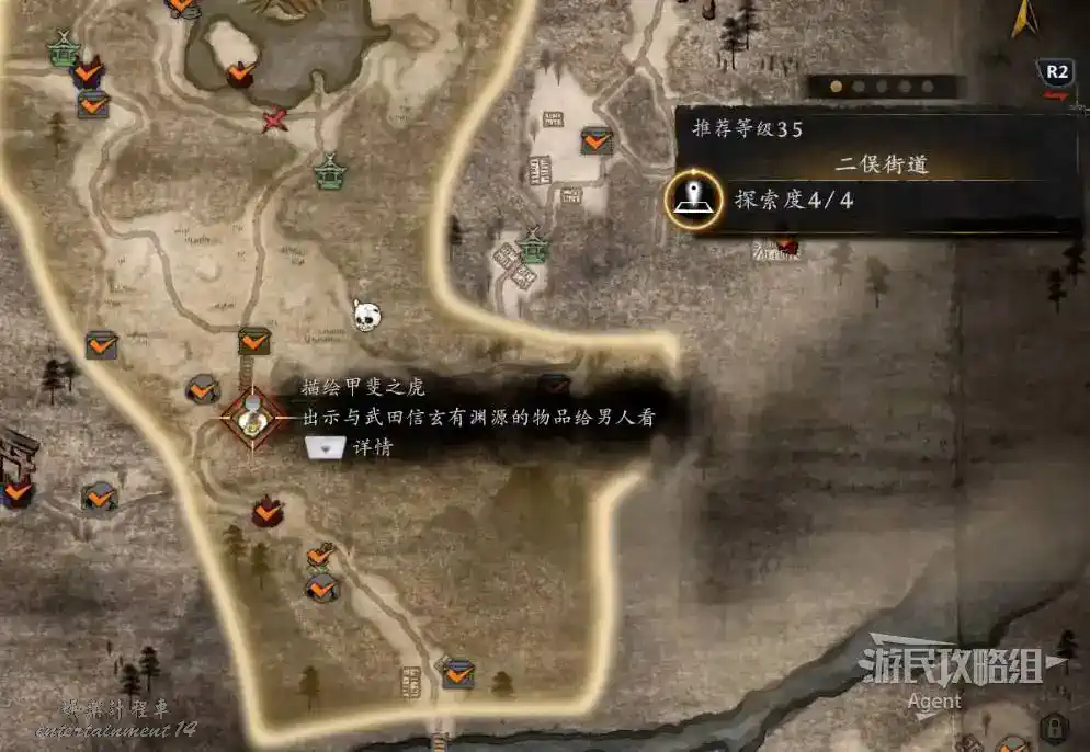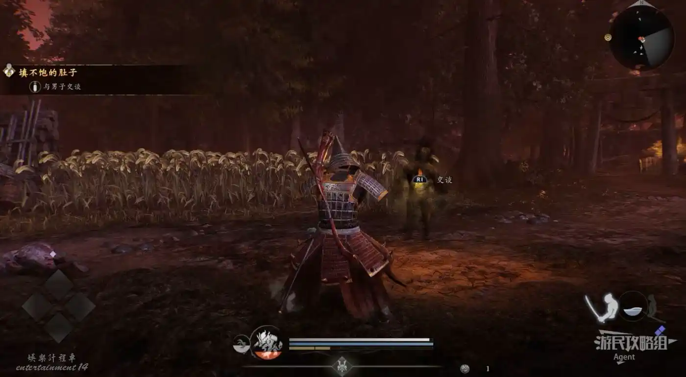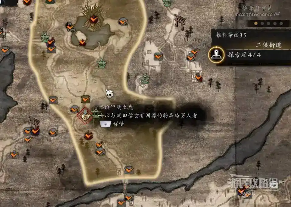 從二俁街道的芒草原神社,來到二俁地區的茶園之裡見到服部半藏,接到奇譚任務“密探的下落”。