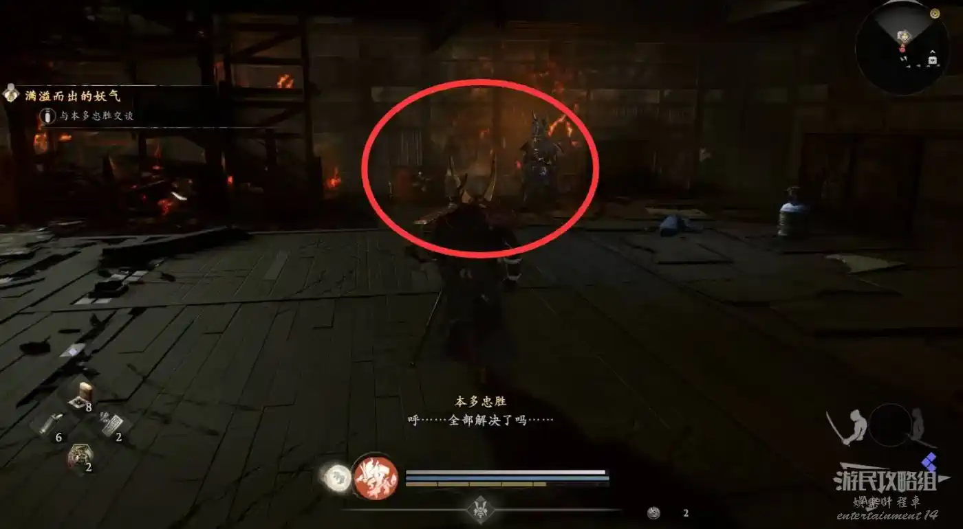 來到樓頂,在樓梯口遇到本多忠勝,他要去西南方查看驛站,接到奇譚任務“滿溢而出的妖氣”。