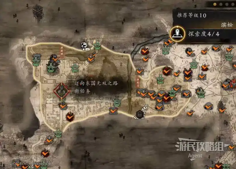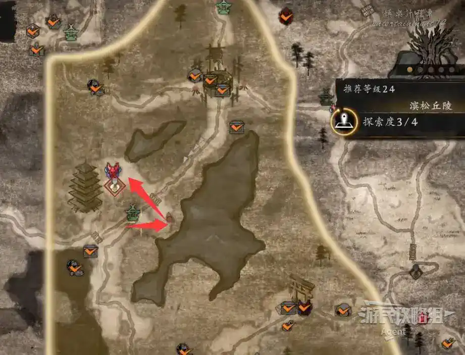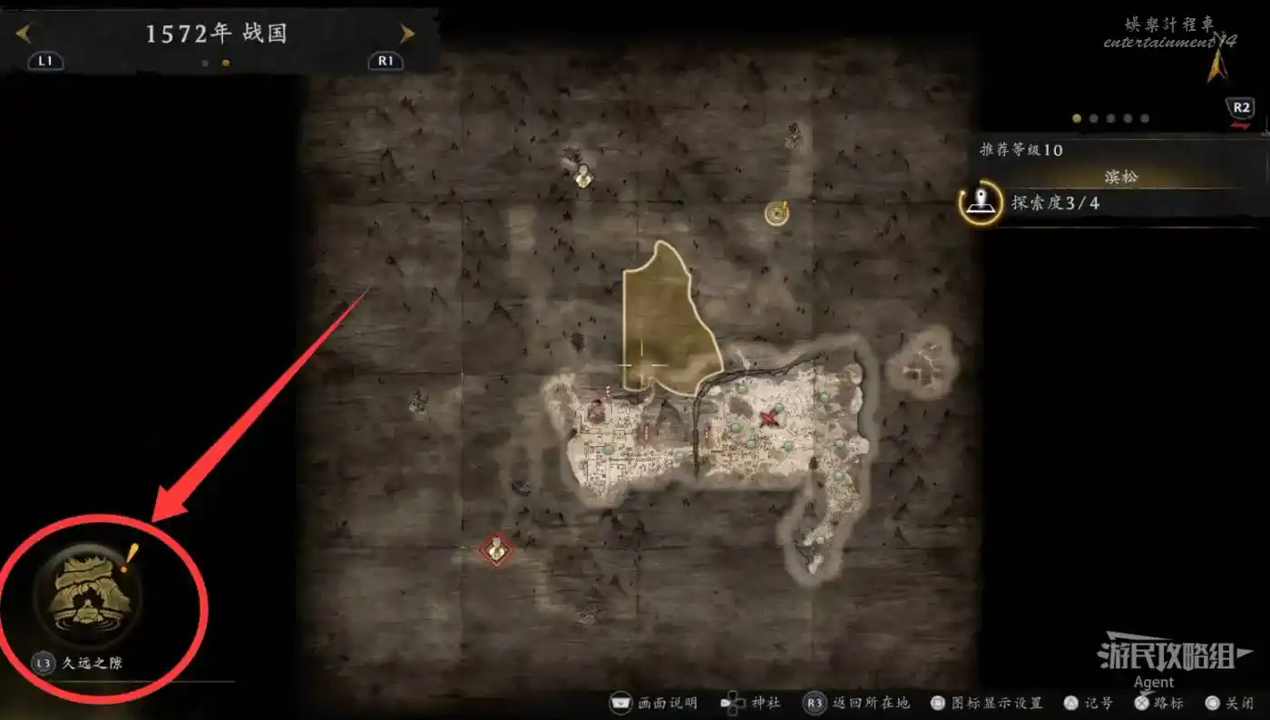 到濱松丘陵的三方原分岔口,地圖上畫著塔的據點之前進不去,現在有鑰匙可以開門了。