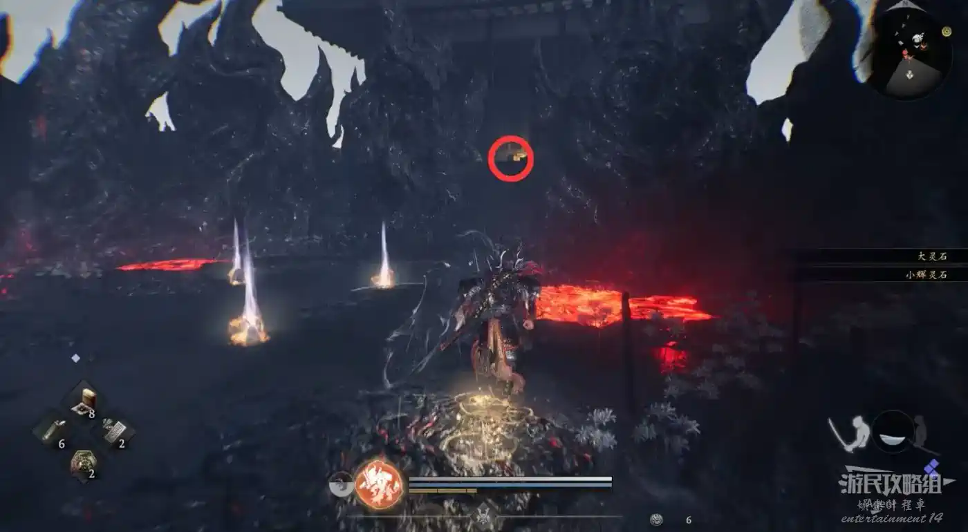 先走下面這條路,下圖位置右拐走到頭是個環形的洞,裡面有個小寶箱。同時在地圖上看到個精華在環形洞中間但是拿不到,先不管,需要等下從別處過來拿。