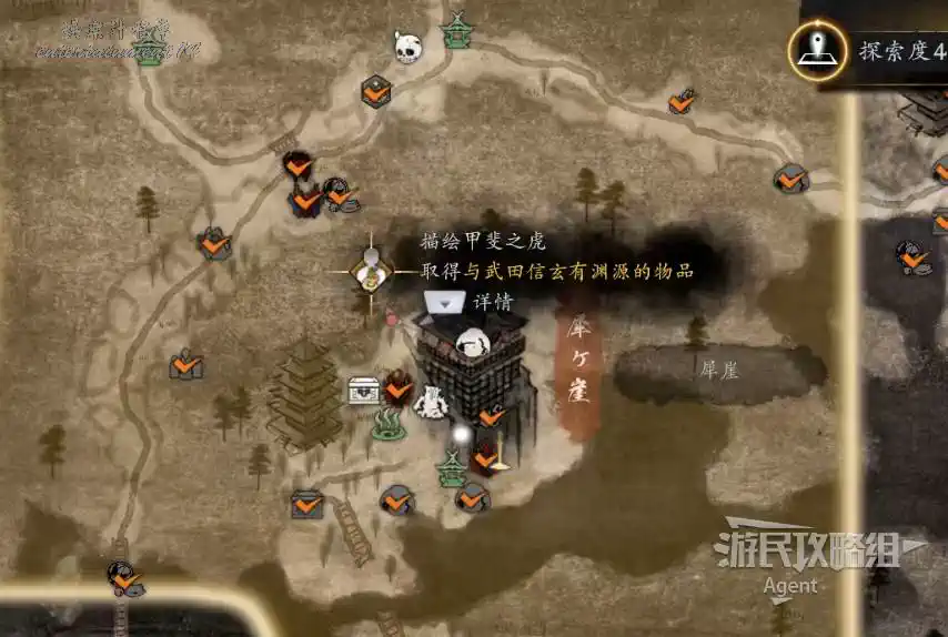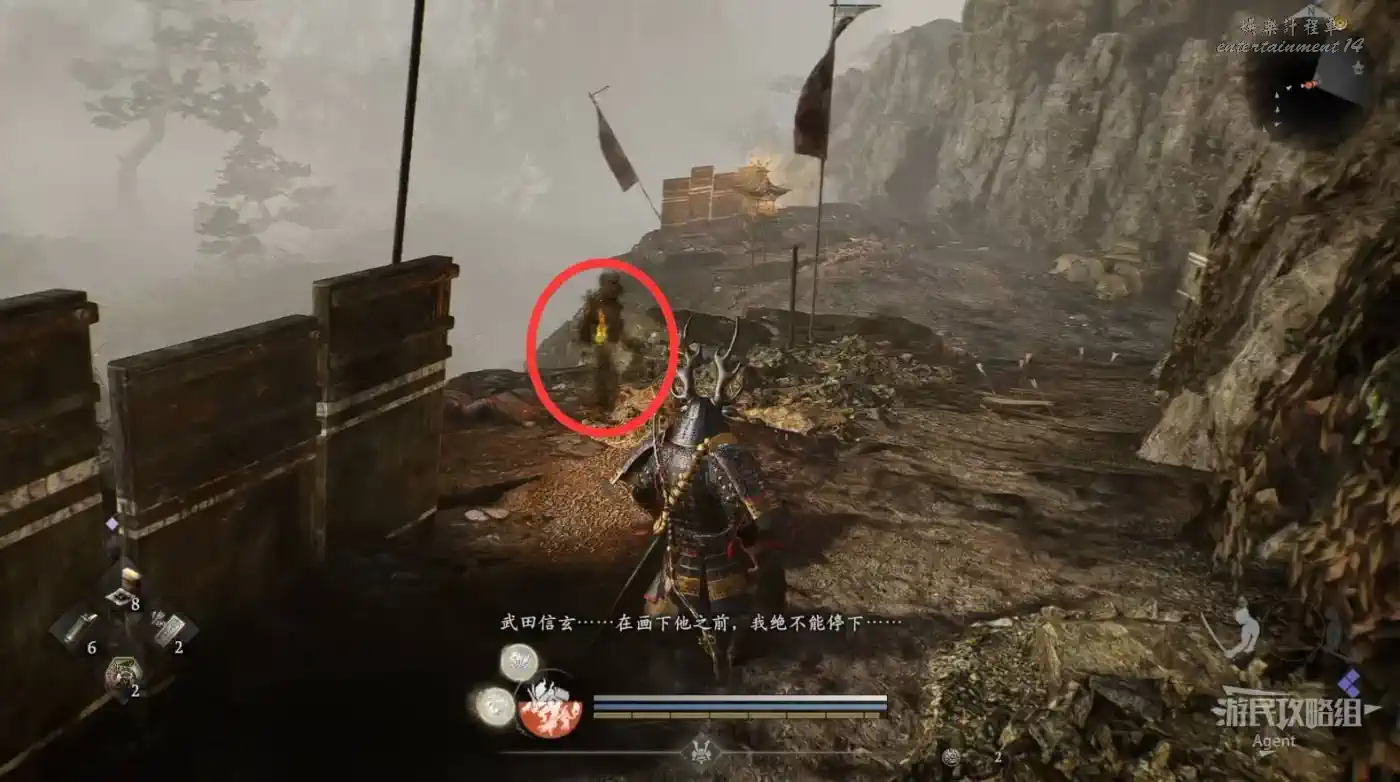 到三方原的犀崖完成主線任務“犀崖之戰”,在打武田信玄之前,經過內參道神社有個地獄附身騎士,先去打開下圖右邊的門拿到“武田紋酒瓶”,這是最後一個與武田信玄有淵源的物品了,到二俁街道的芒草原神社找鬼魂交任務得到“武田信玄像”。