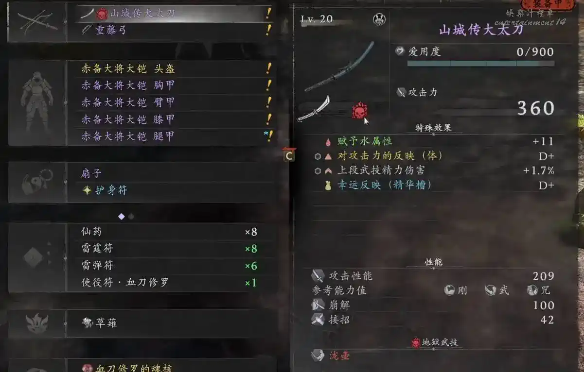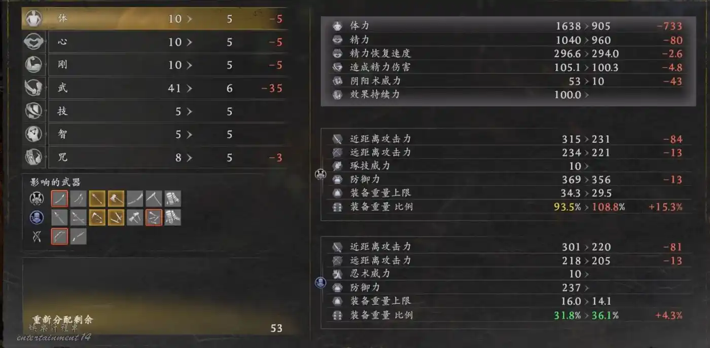 “剛”屬性:影響體力和裝備重量上限,建議初期加到10點就足夠了。中後期隨著武器裝備品質重量的提升,外加經常使用斧頭、大太刀、手斧、手甲這類武器時,可以適當多加一些,裝備重量上限務必保持在綠色數字為最好。