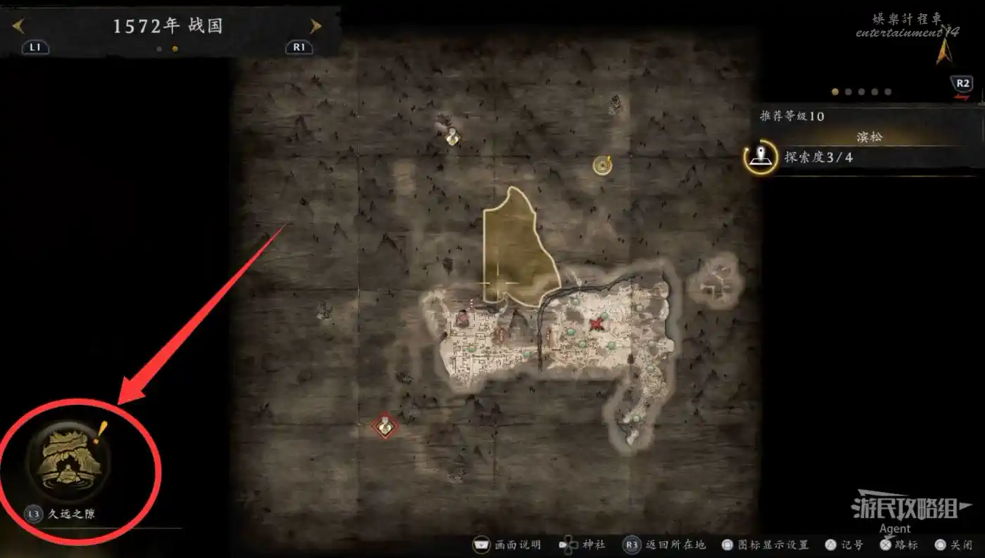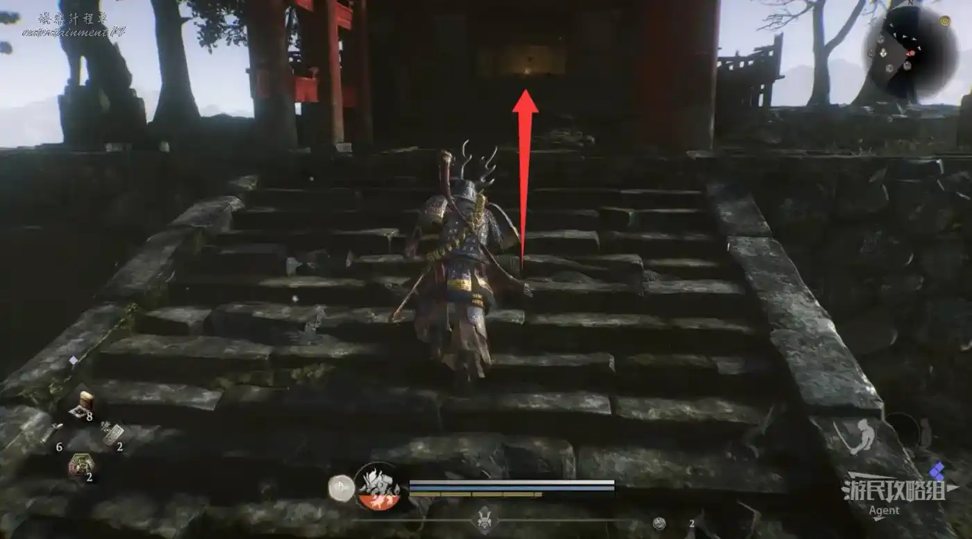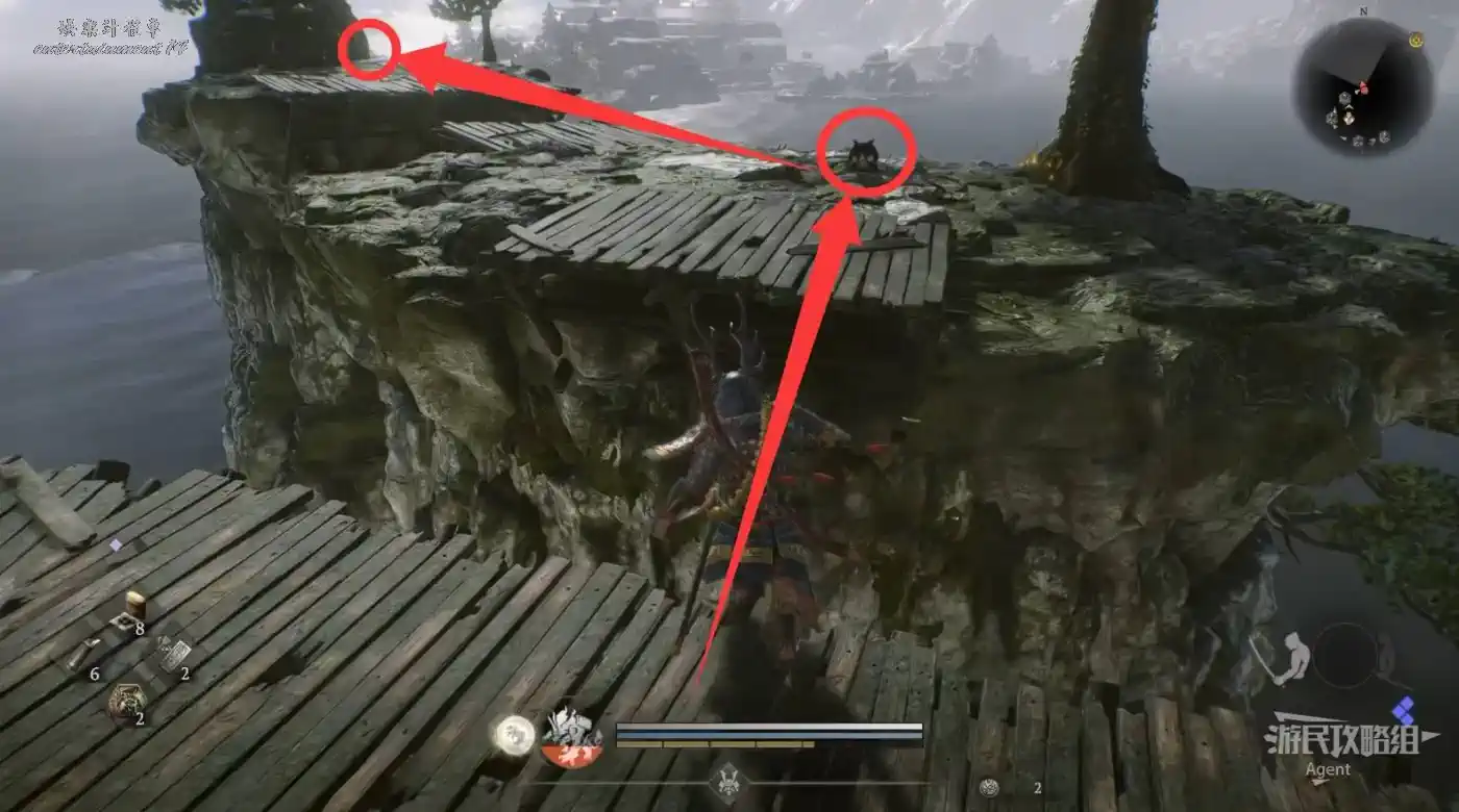 到戰國地圖西面的佐鳴湖,往西穿過小地獄,在斷橋橋頭遇到只【善擦】。因為橋斷了無法通過,它會帶你走小路抵達島上的山頂,途中會經過三個靈脈。