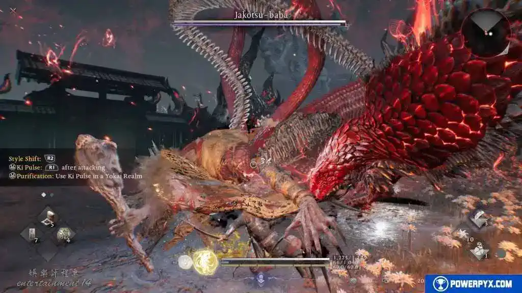 說回這場BOSS戰,始終要設法閃避到BOSS背後,並從背後發動攻擊造成更高傷害。忍者風格的忍雙刀是最敏捷的武器,非常適合快速移動和閃避,目前應該有足夠的精力來打出兩套完整連招。然後閃避到安全距離,在精力恢復期間使用忍術,投擲手裡劍以及已解鎖的其他忍術和陰陽術,這樣可以在等待精力恢復的同時造成傷害。