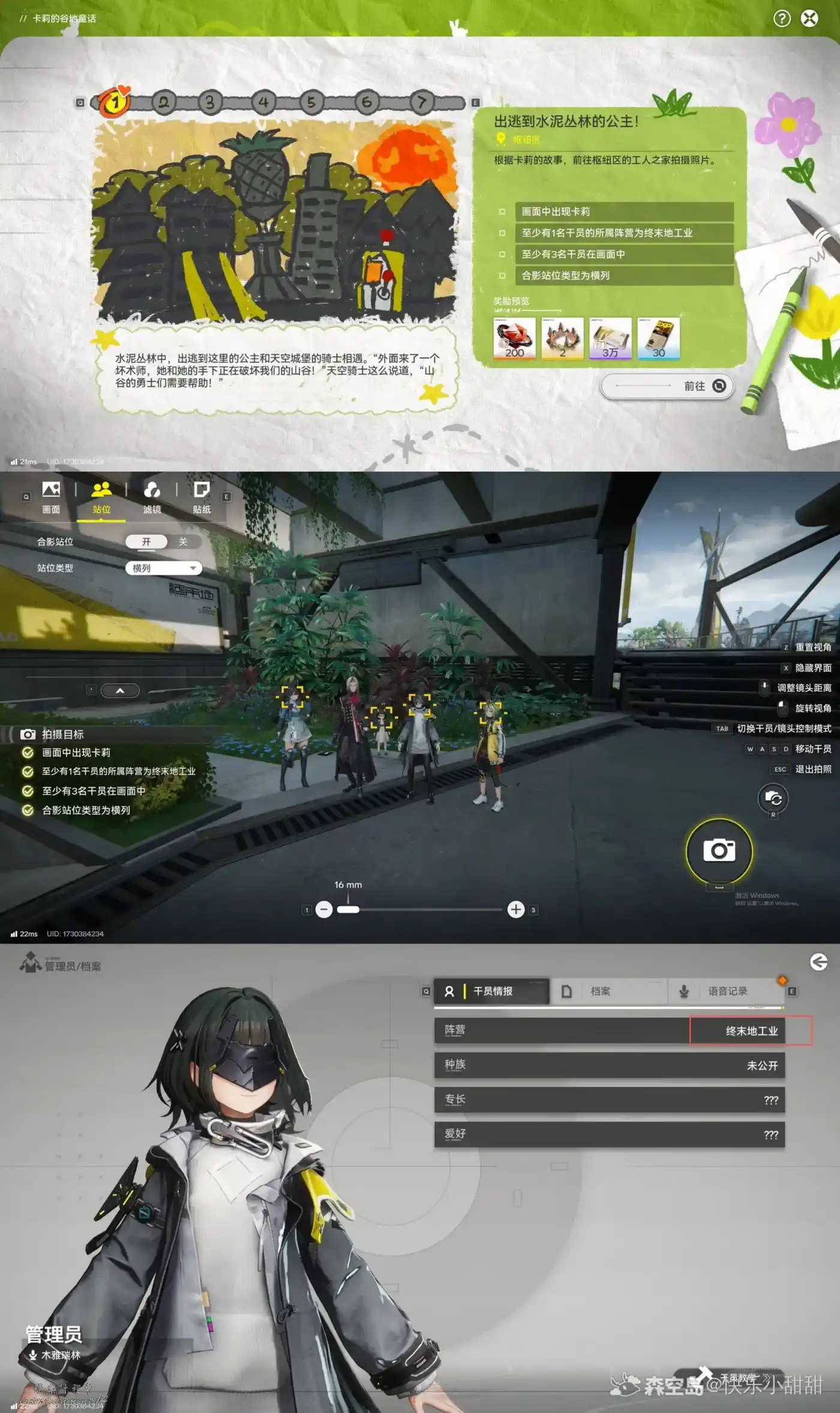 明日方舟 終末地 卡莉的谷地童話拍照攻略 8 2 月 2026-02-08 廣告 作者:快樂小甜甜 來源:skland 出逃到水泥叢林的公主 畫面出現卡莉 至少1名幹員陣營為終末地工業 (按C打開角色詳情 下方檔案即可查看陣營 管理員即可) 至少3名幹員在畫面中 合影站位元為橫列 (按拍照鍵互動後切換站位類型即可) 獎勵200嵌晶玉+存續的痕跡x2 最高的塔! 畫面中出現協定共振塔與宿營地 至少1名幹員職業為術士 (如圖三佩麗卡即可) 至少3名幹員在畫面中 合影站位元為方陣 獎勵200嵌晶玉