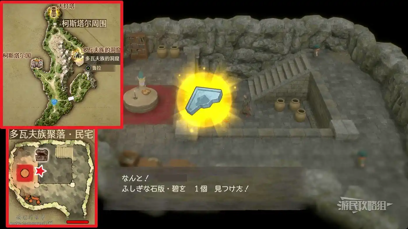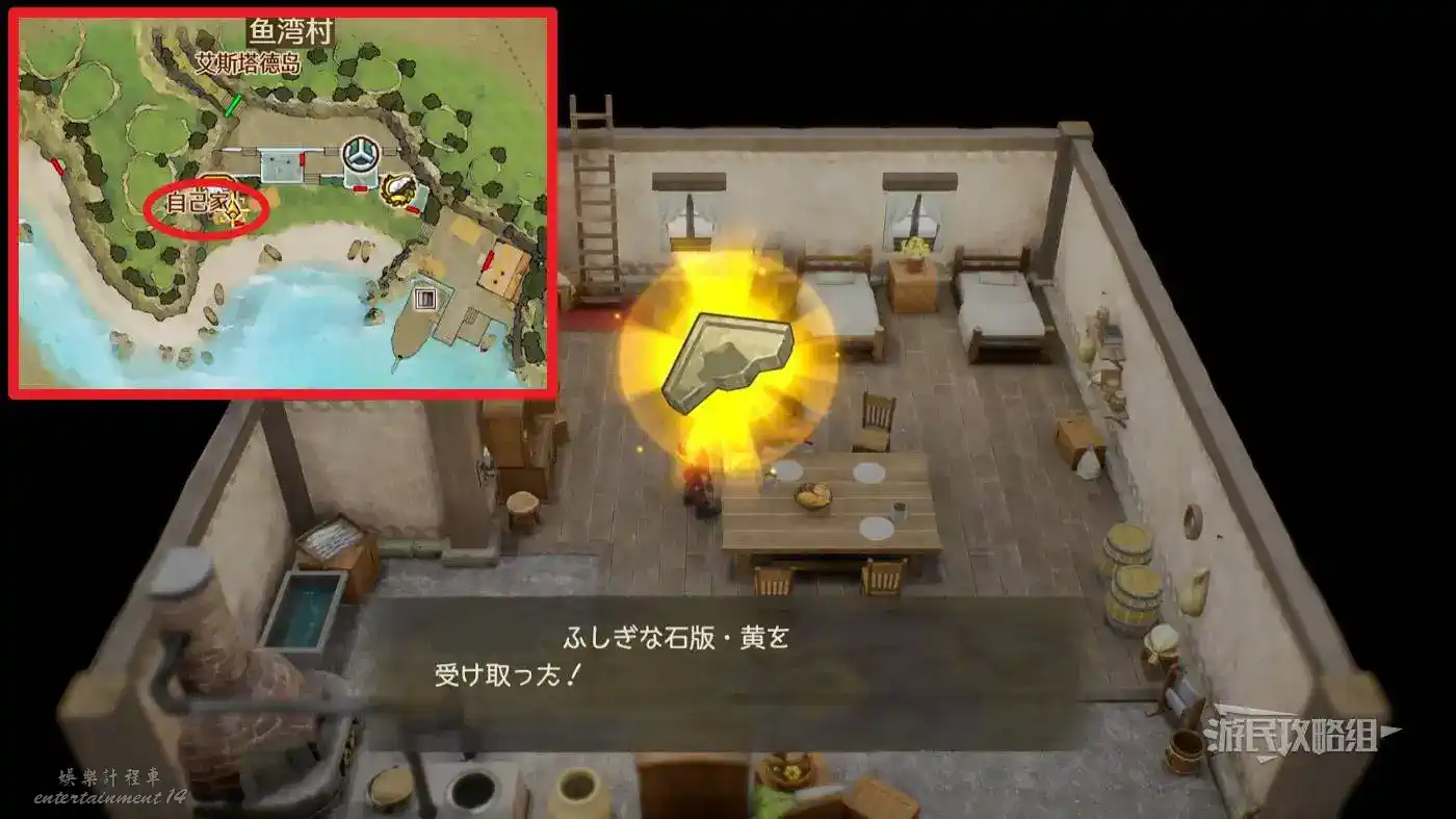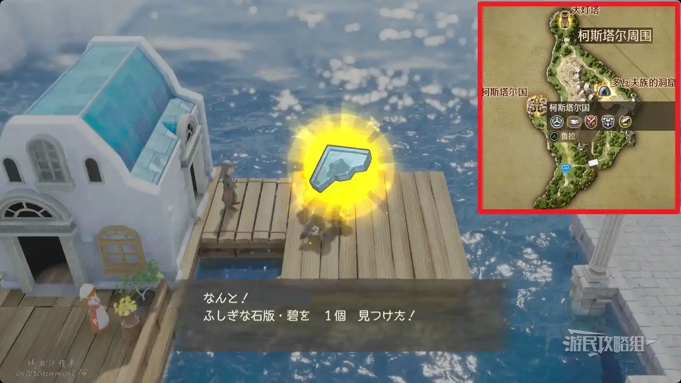與地圖中間藍點標記處的魚人對話,然後前往艾斯塔德島右下角的【海底王的家】,與海底王對話,再回到【珊瑚洞窟】找魚人對話即可獲得石板。