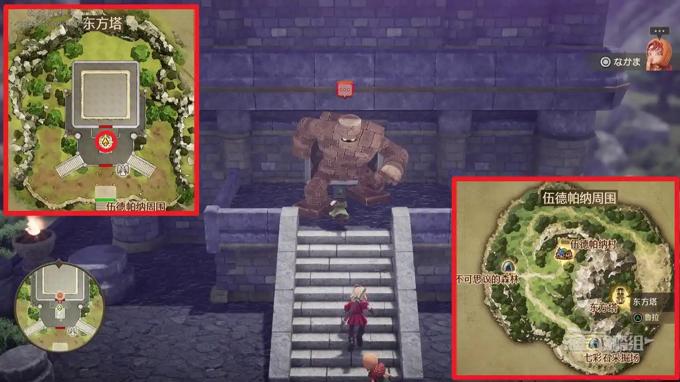 位於【過去】伍德帕納周圍【東方塔·5樓】。可以先從【神秘神殿】左數第一組黃石板底座的中間底座前往【過去-伍德帕納周圍】(穿過不可思議的森林)。